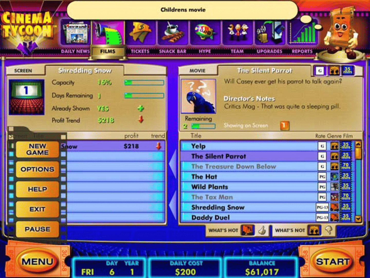 Cinema Tycoon Gold is a game where you get a chance to manage your very own cinema. Do you have what it takes to become a Cinema Tycoon?