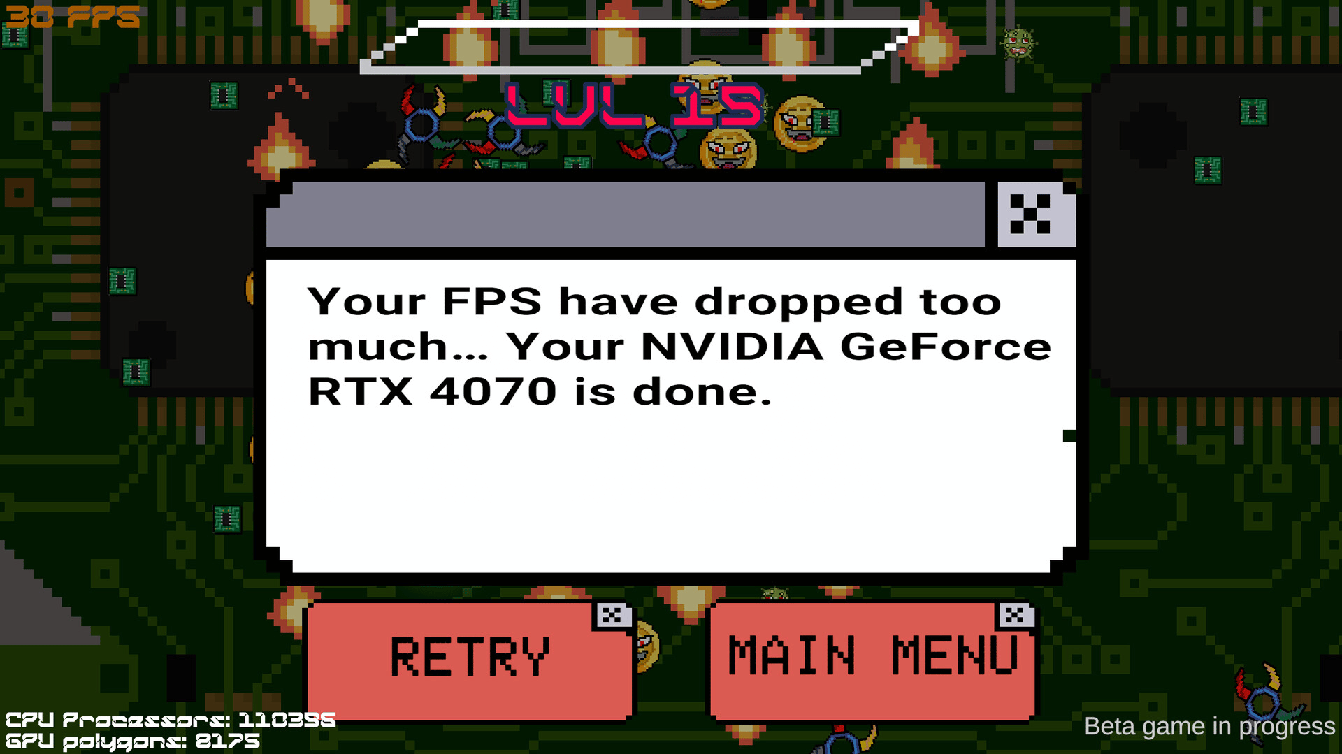 If your FPS drop to 30 you lose! GPU Inferno is a survivor bullet hell where you play as a graphics card fighting off viruses, crypto miners, and malware. Your real FPS are your health. When the GPU is damaged, actual background processes on your PC will slow down your FPS.