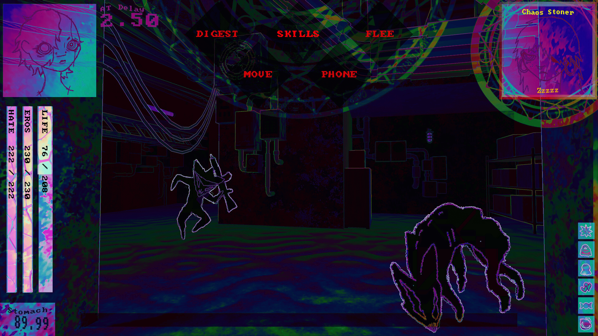 Psychedelic gutter sludge CRPG for hot people. Nonlinear, interaction-rich psycho bad girl roleplay in a decaying postmodern megastructure. Fast-paced turn-based combat lets you eat cops, puke on feds, summon your gfs in battle and more. Go to raves. Get pierced. Drink blood. Escape the city.