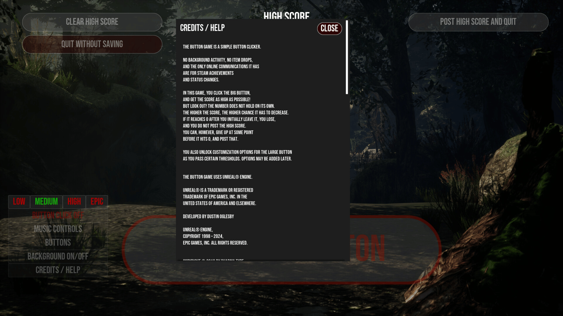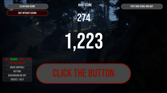 The Button Game is a simple button clicker. Simple. You click the big button, and get the score as high as possible! Look out! The number does not hold on its own. The higher the score, the higher chance it has to decrease. If it reaches 0 after you initially leave it, you lose.