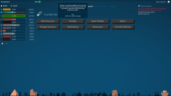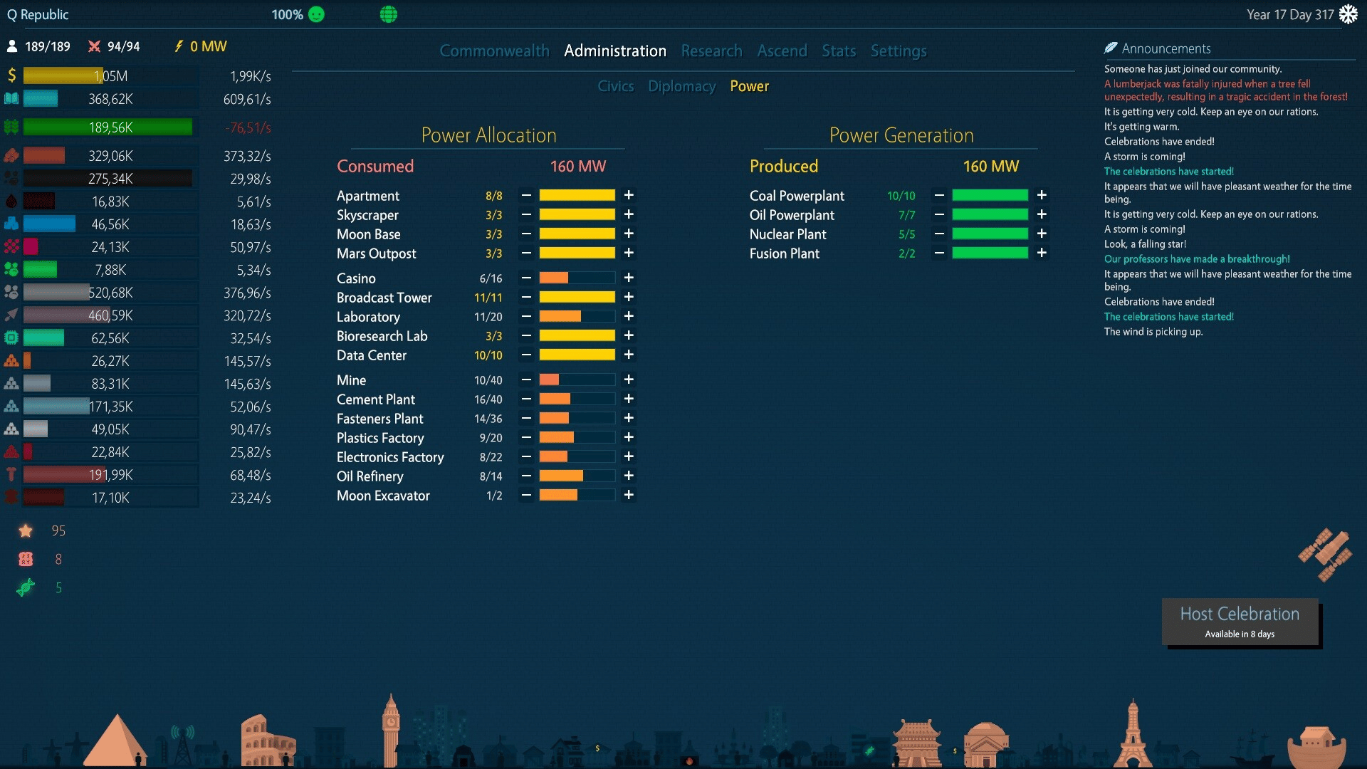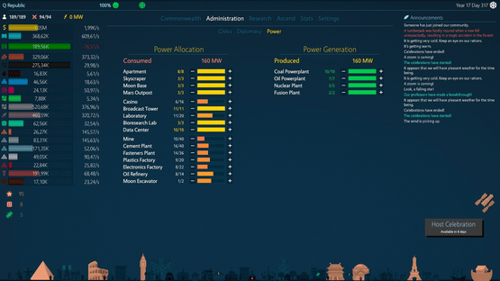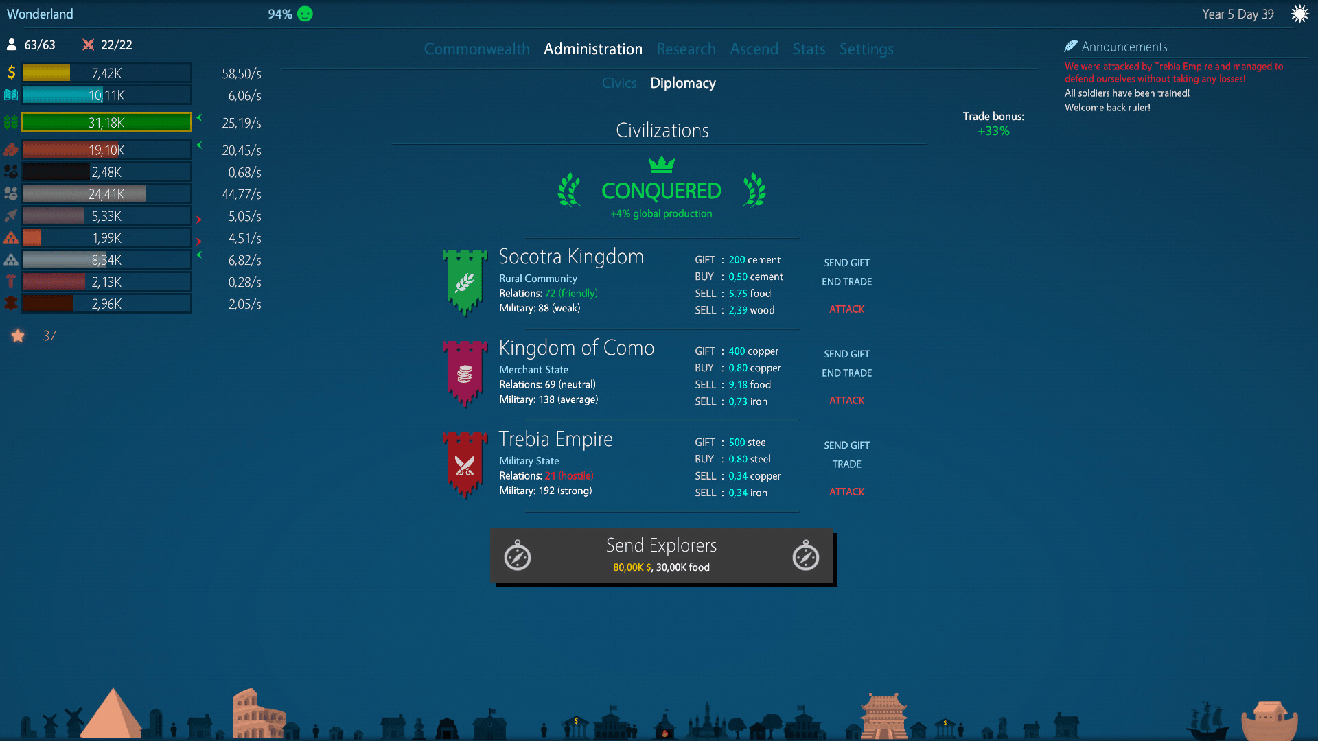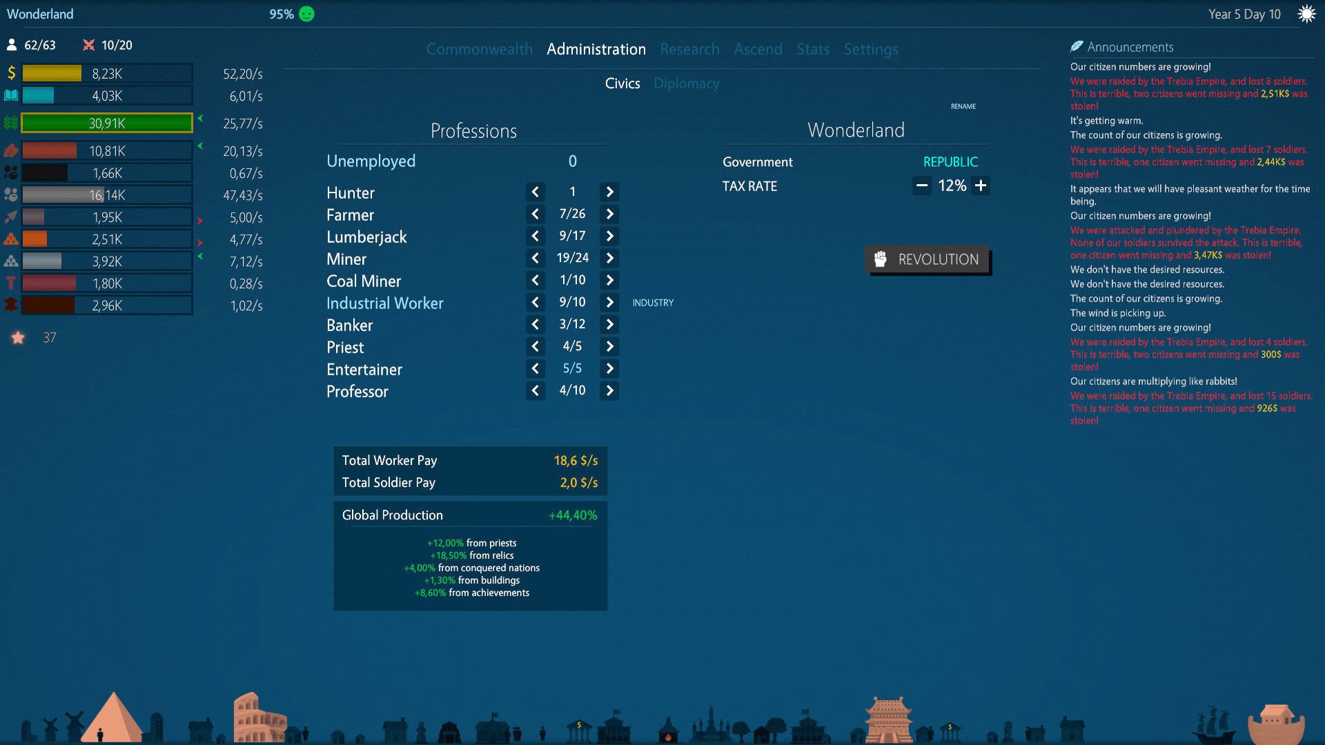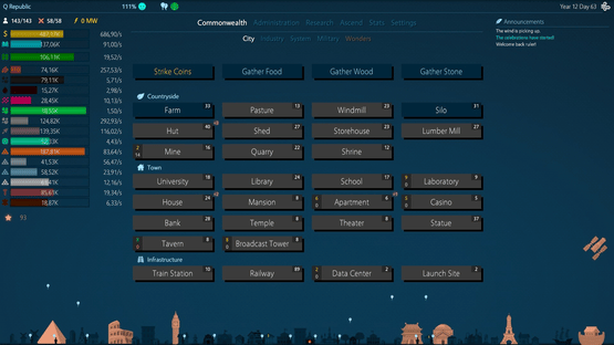 Idle Commonwealth is an idle game that pays homage to the best of the idle genre. Start small, grow your commonwealth, maintain morale, establish governance, invent technologies, trade and conquer your neighbors.