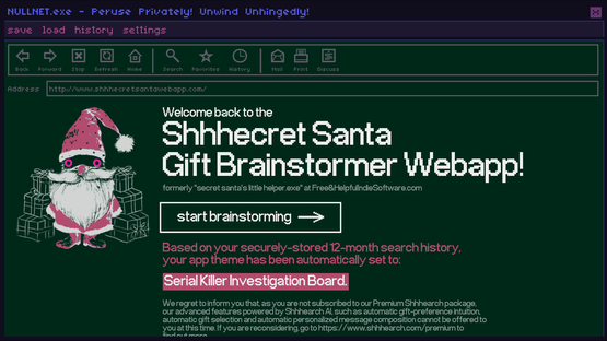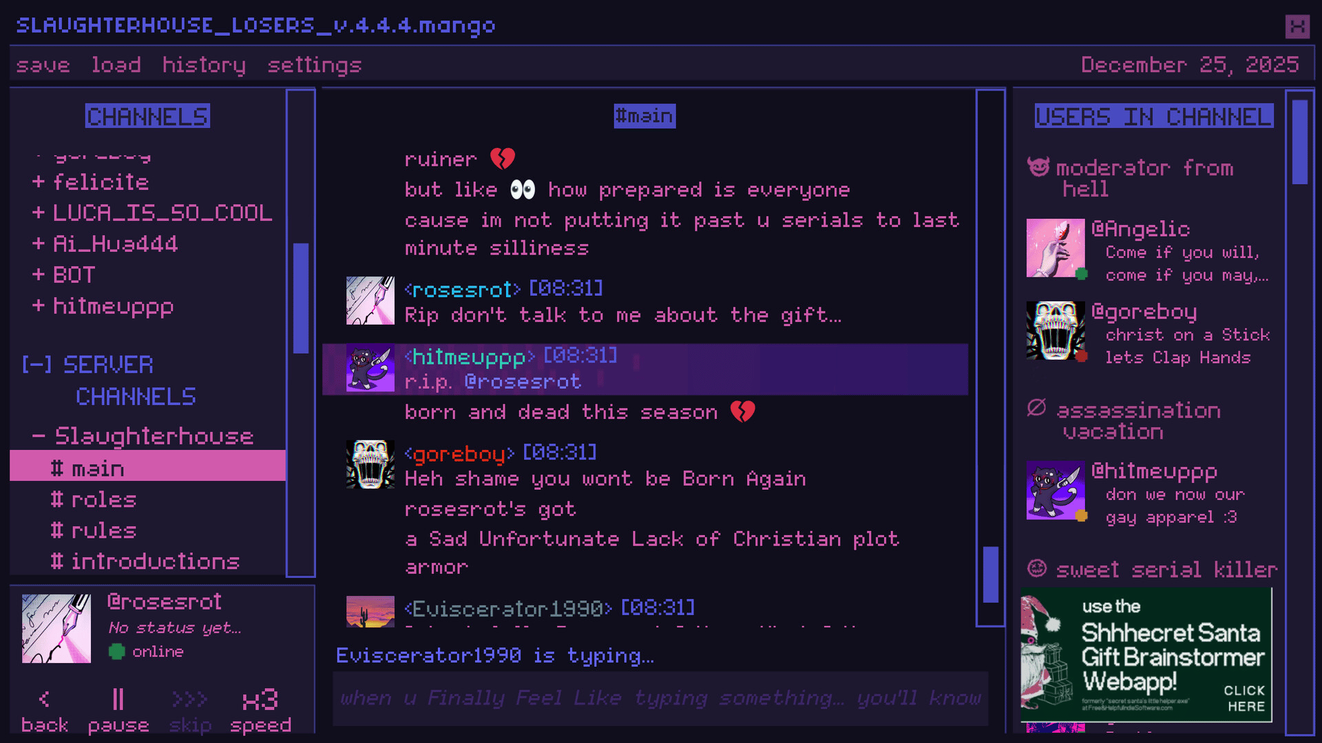 In this festive standalone addition to the satirical dating chatsim Killer Chat! series, journey through the serial killer server’s past, present & future to learn more about the gang and find the true meaning of Christmas. What's the worst that could happen?