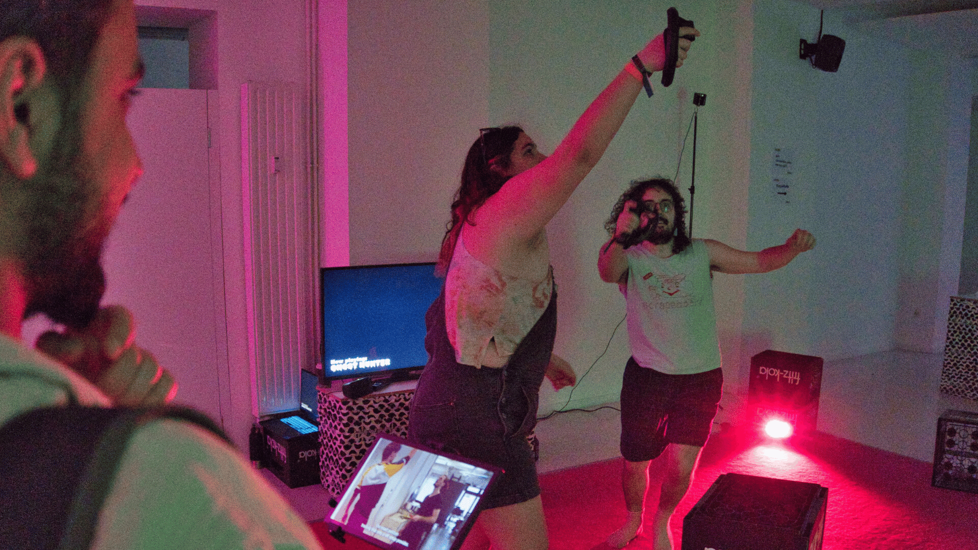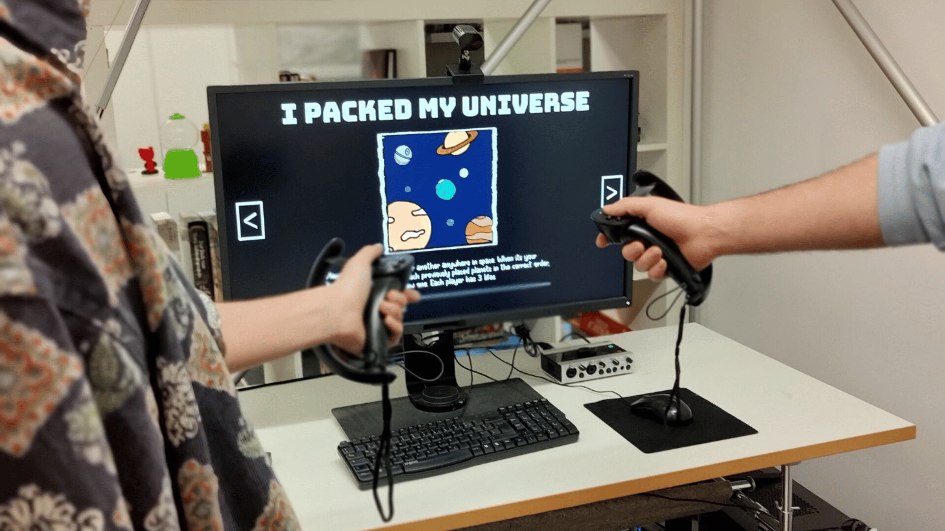 VR without the headset. Games without visuals. Each player gets one of the VR controllers, no headset needed. All included games only use vibrations and sound to convey the game, while you play in the real world.