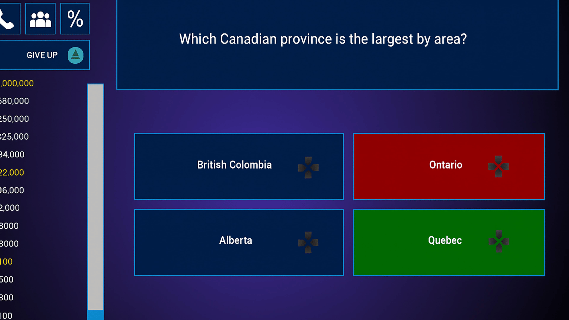 Oh, Canada! is a fast-paced trivia game that challenges your knowledge of the Great White North in a high-stakes, game show-style format. Answer 15 increasingly difficult questions drawn from a curated pool of over 40, covering Canadian geography, history, pop culture, and more, as you climb from $100 to a pretend $1,000,000. Use lifelines like Call a Friend, Ask the Public, and 50/50 to stay in the game, with full gamepad support and a dramatic soundtrack to keep the pressure on. Whether you're a proud Canuck or just maple-curious, Oh, Canada! brings quiz-night fun to your living room.