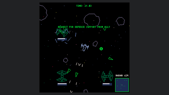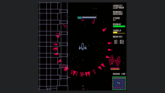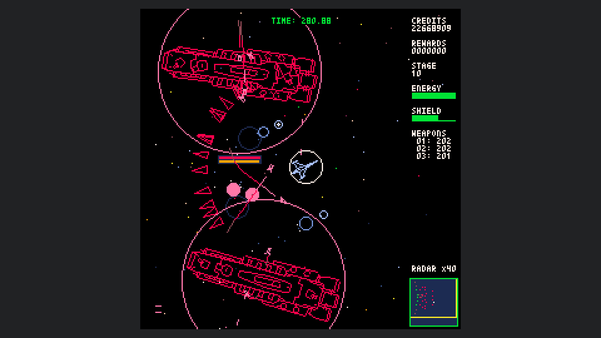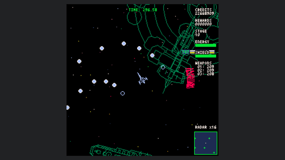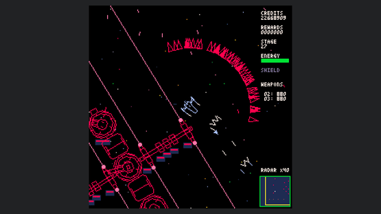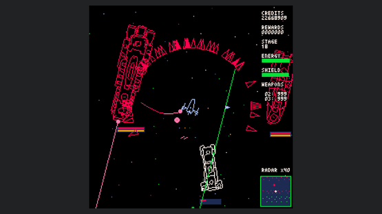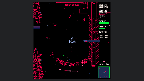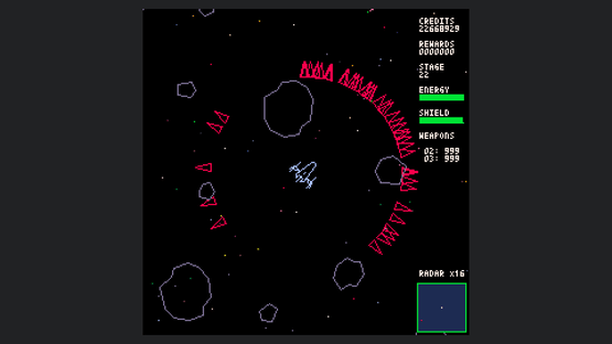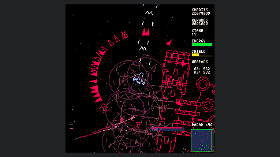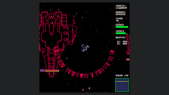 Starship Scarwolf is a 2D top-down omnidirectional shooter. As I'm a fan of vector scan games, I aimed to create an expression using only wireframe rendering. However, I couldn't achieve this with just dots and lines, so I also used fill and circle drawing functions.