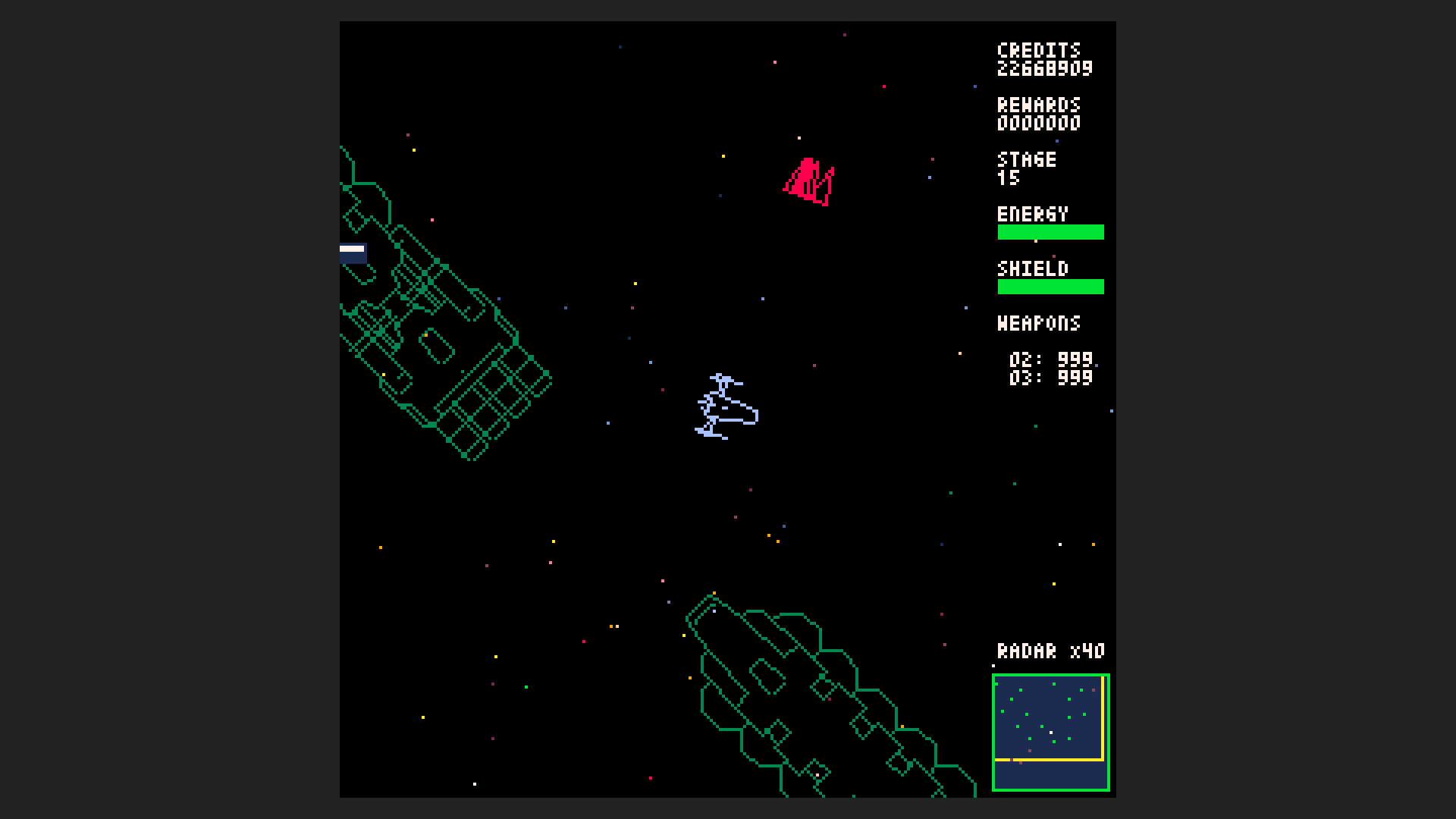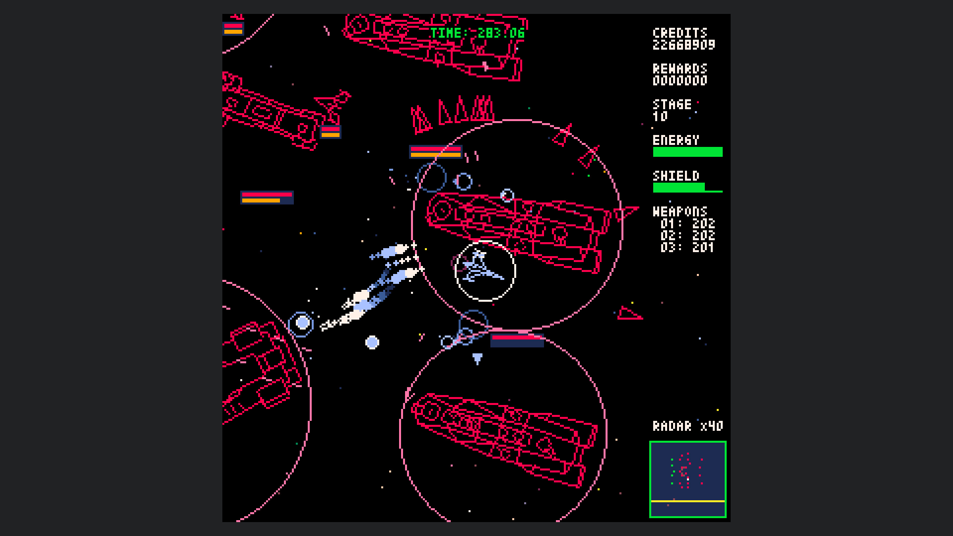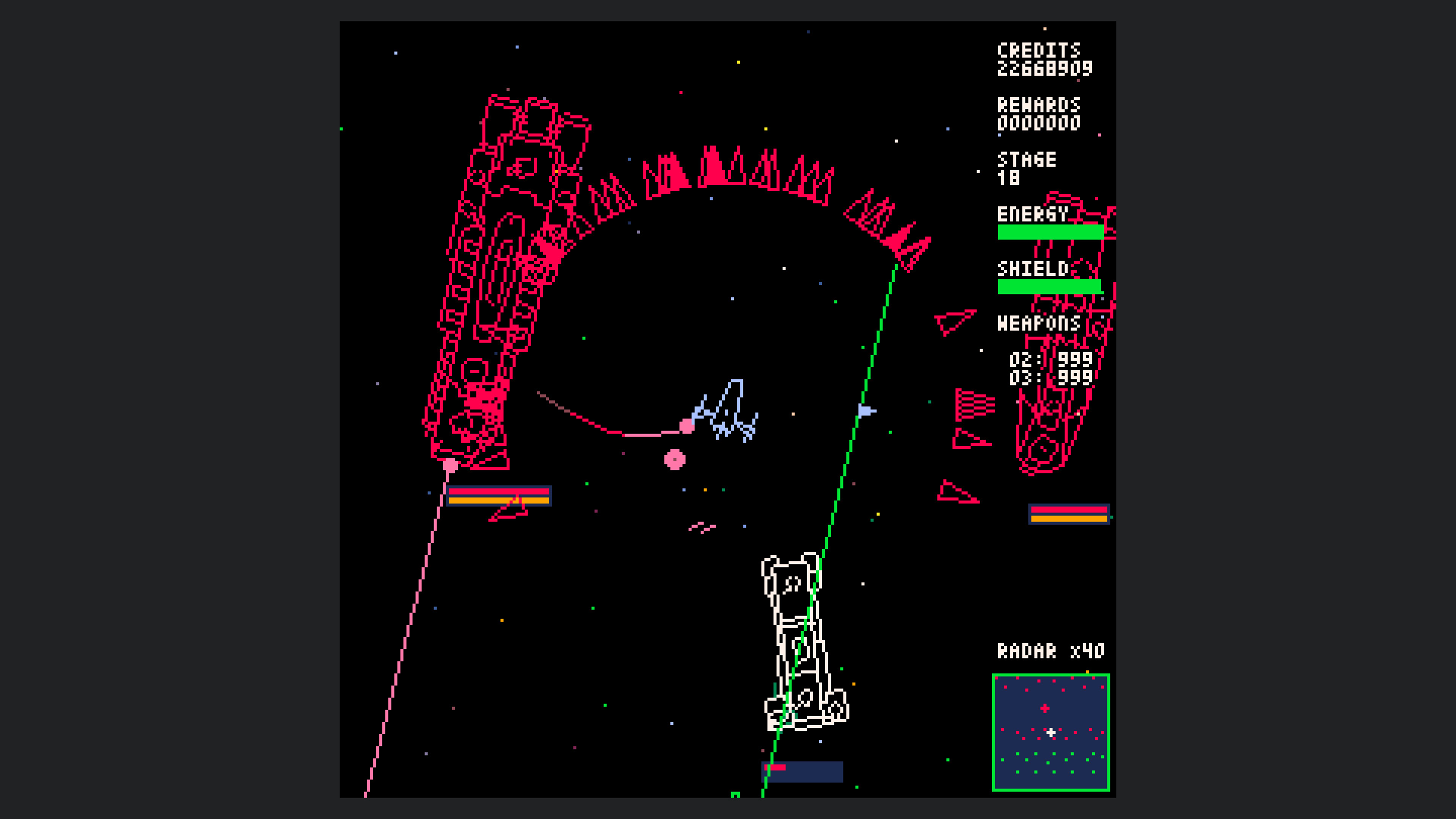 Starship Scarwolf is a 2D top-down omnidirectional shooter. As I'm a fan of vector scan games, I aimed to create an expression using only wireframe rendering. However, I couldn't achieve this with just dots and lines, so I also used fill and circle drawing functions.