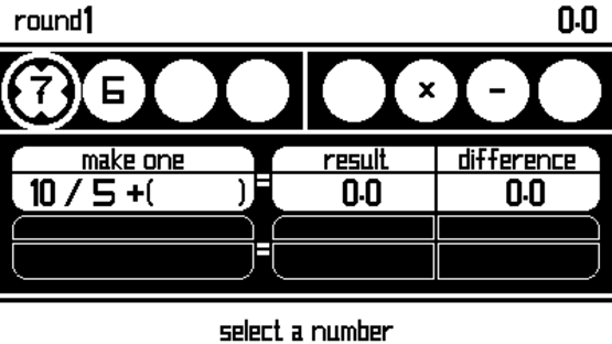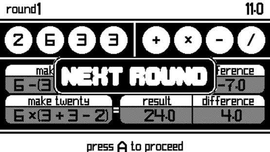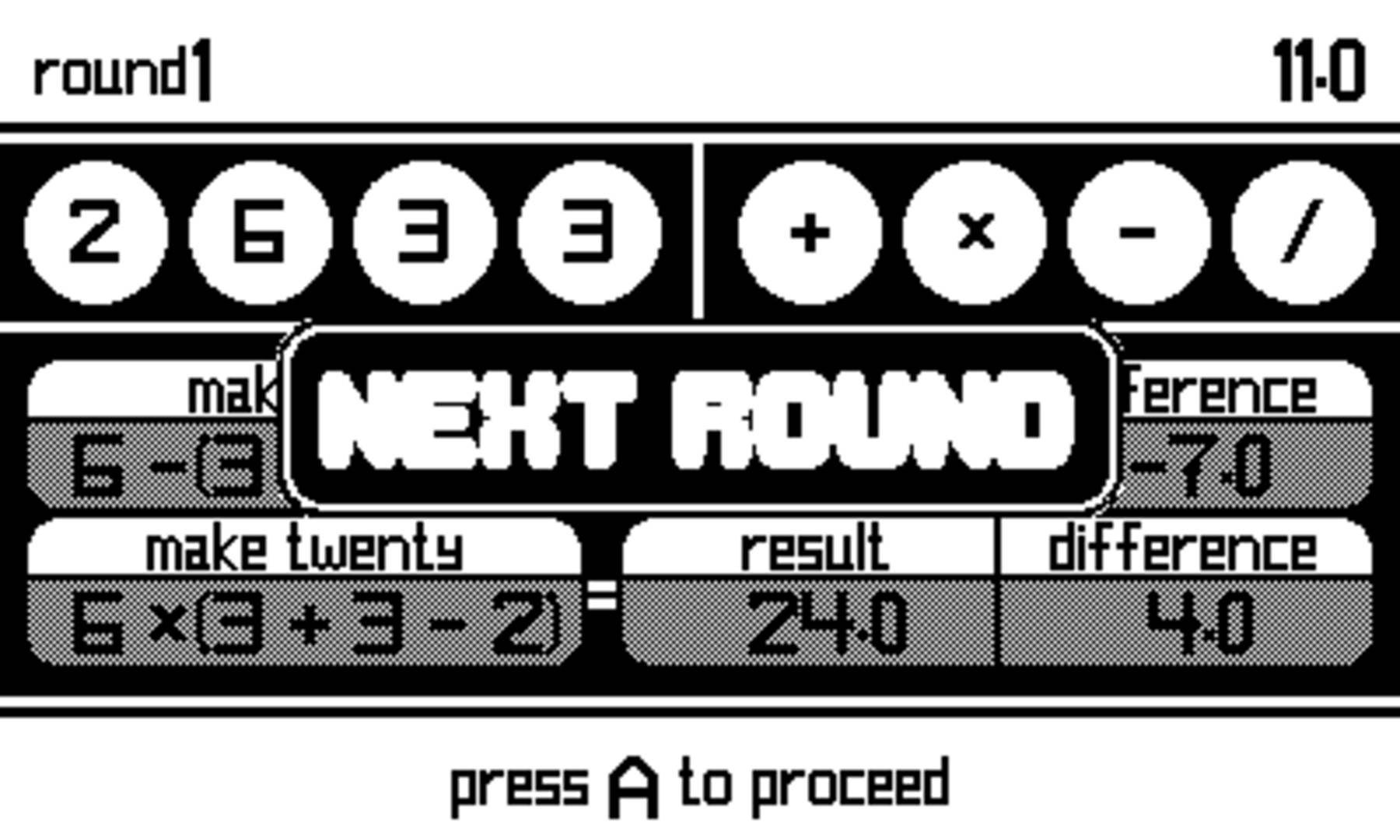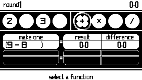 In Pocket Math you are given 4 numbers and 4 functions. You must use all the numbers and 3 functions to create equations resulting in 1 and 20.