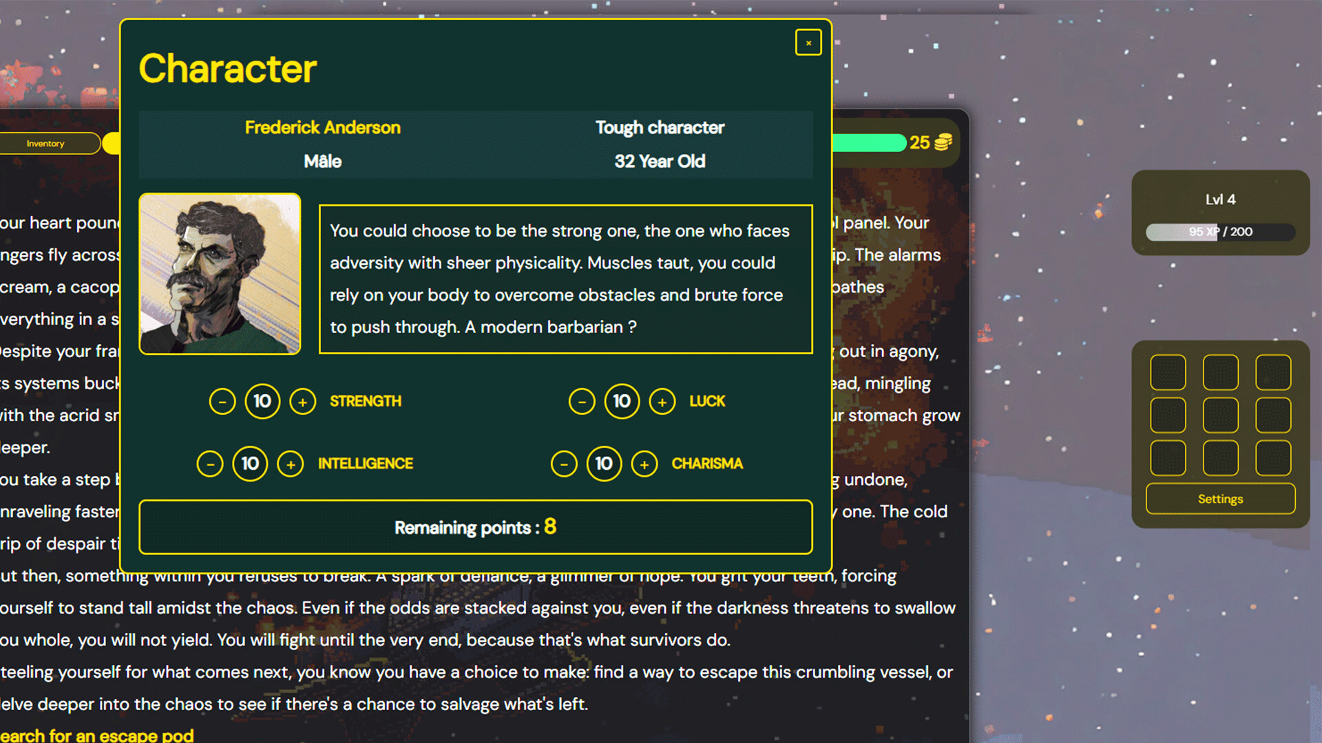 A choice-driven narrative game with RPG mechanics, filled with cosmic wonders and horror. Forge your own path across more than 50 unique endings. Barter, upgrade your character, fight, and explore alien worlds, overcoming every obstacle to find your way back to Earth… and to your daughter.