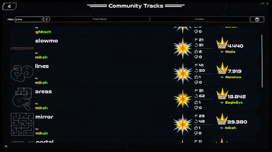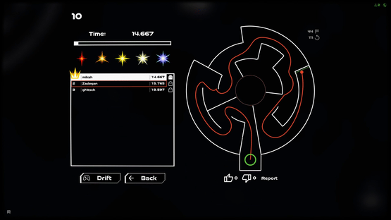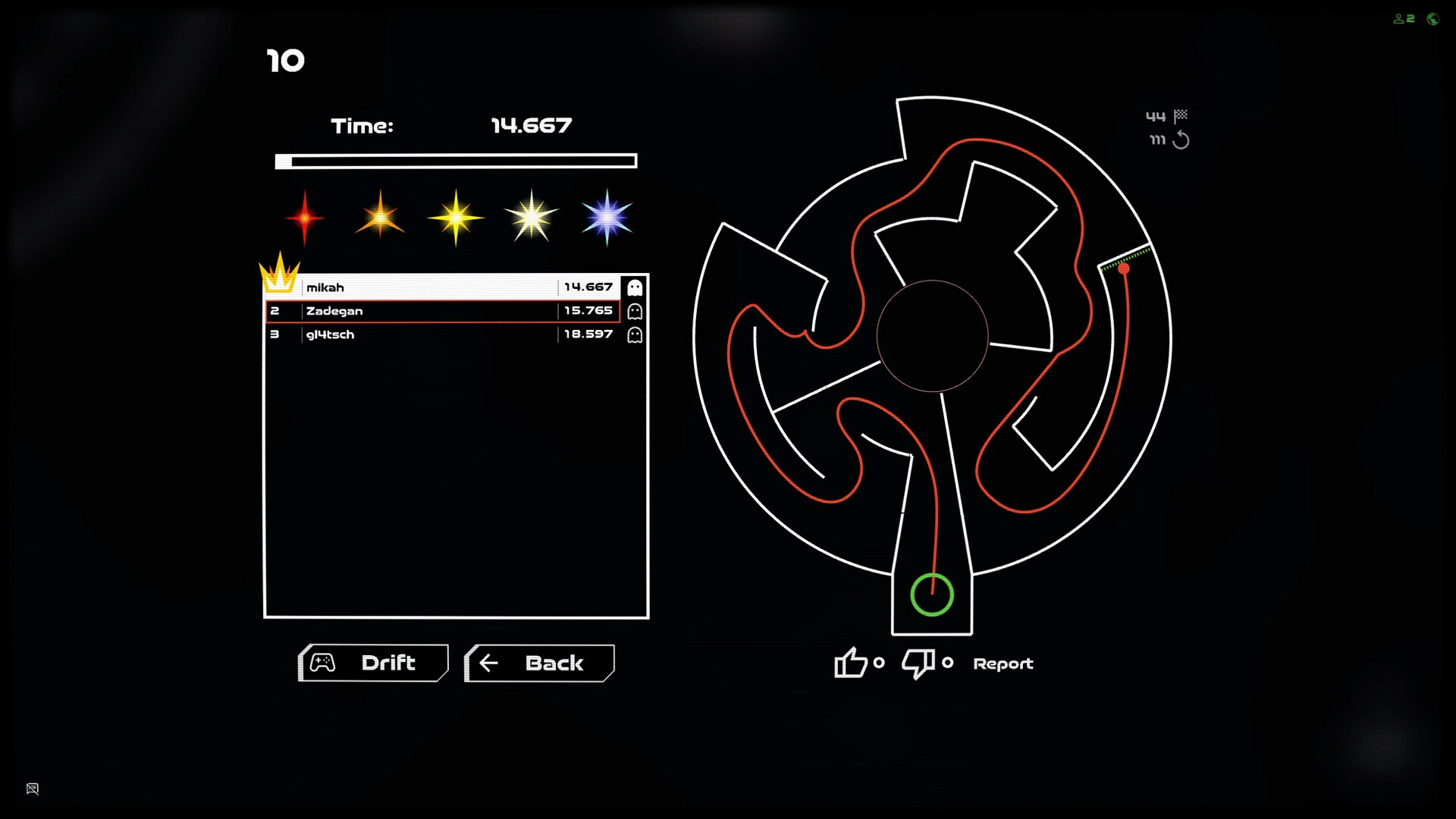 A competitive space racing game. Drift on player built tracks for the best times and claim your rank on the global leaderboards.