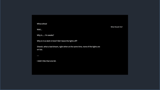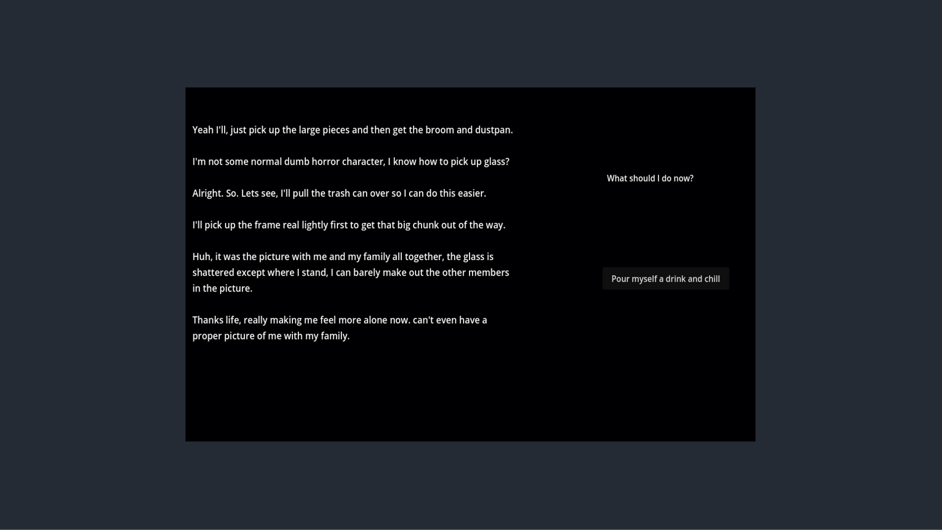 A text-based horror game focused on atmosphere and user choices, it's highly story-based and builds atmosphere by allowing a player to make choices that determine whether they make it out alive or not.