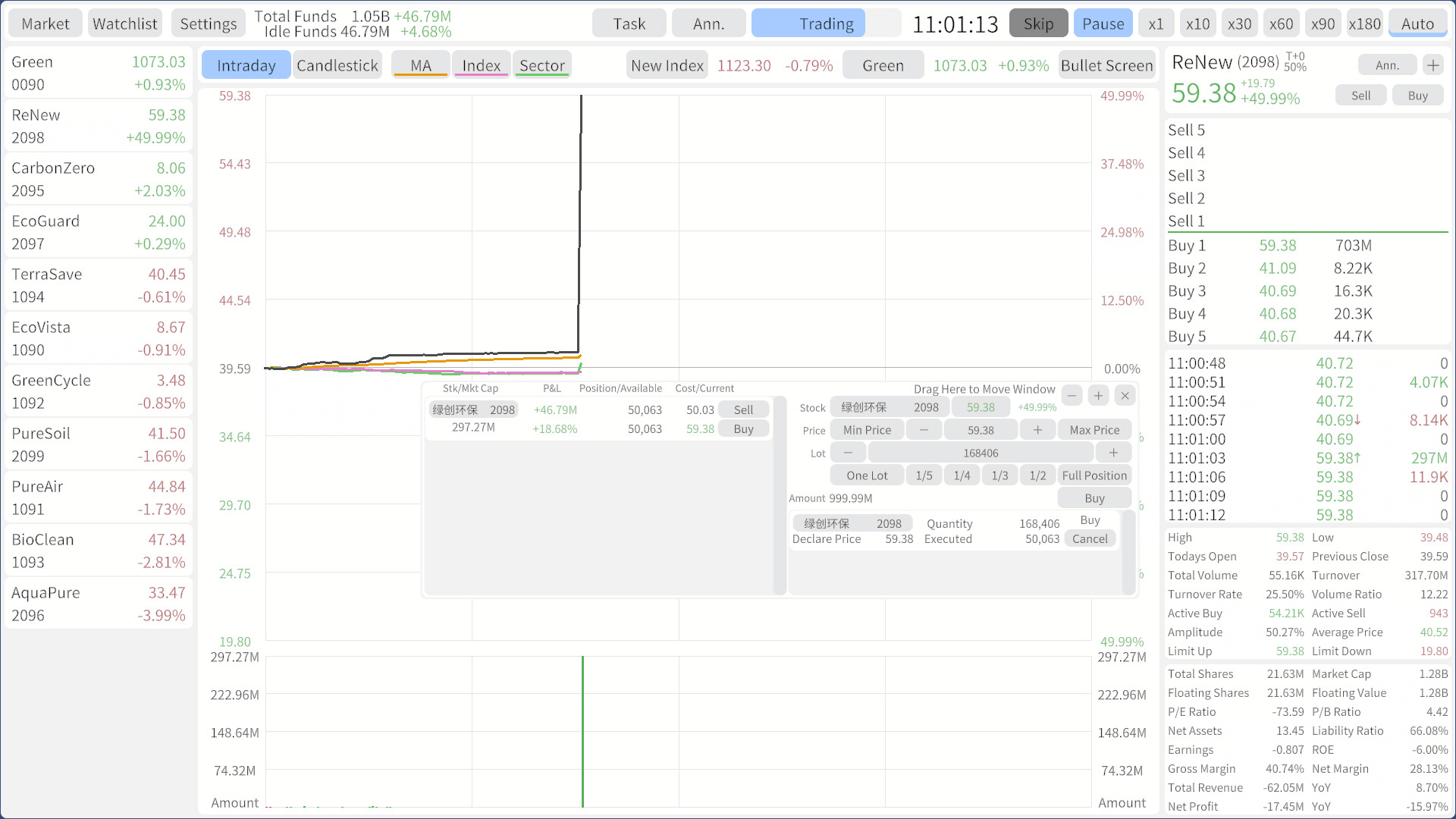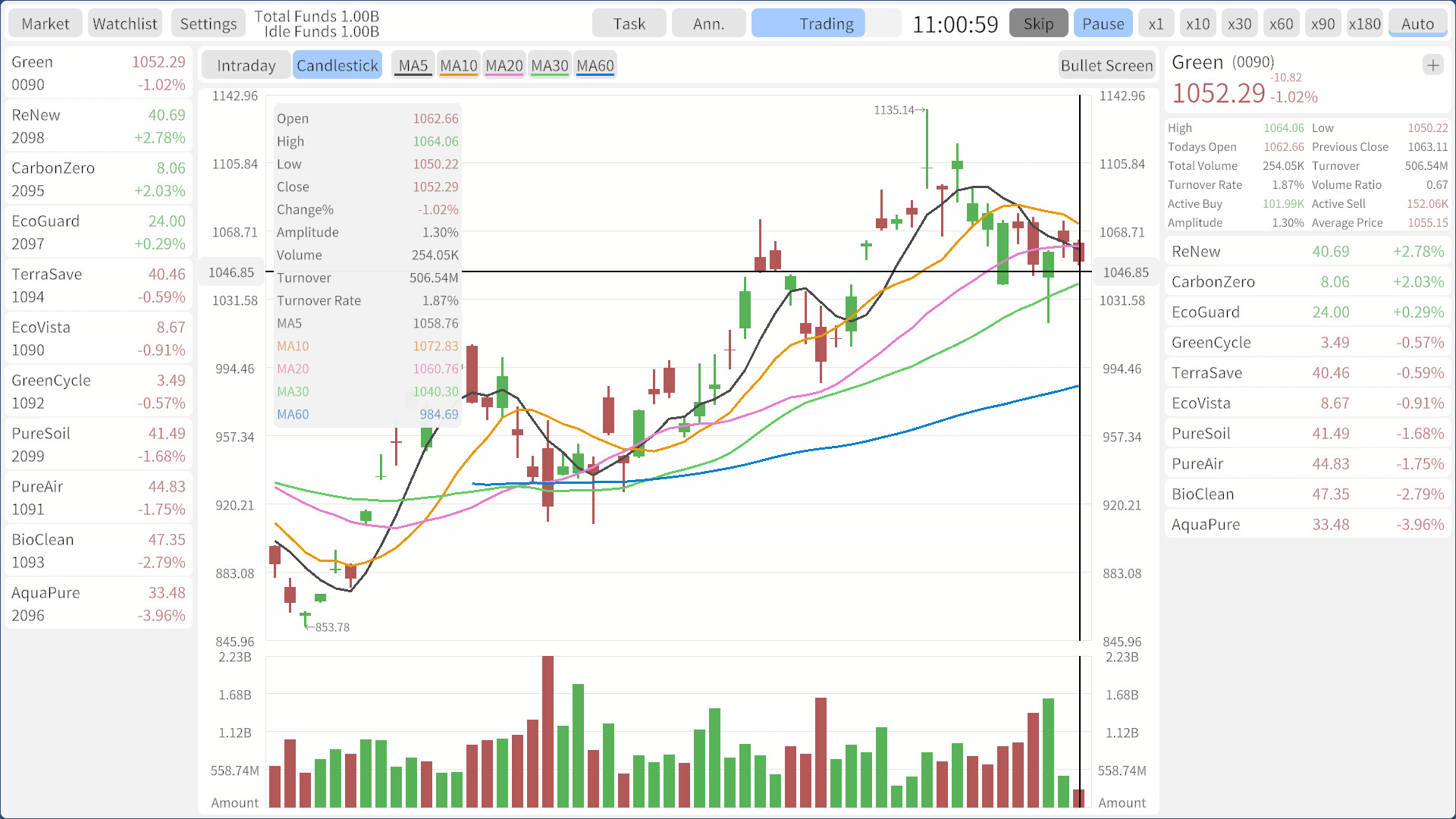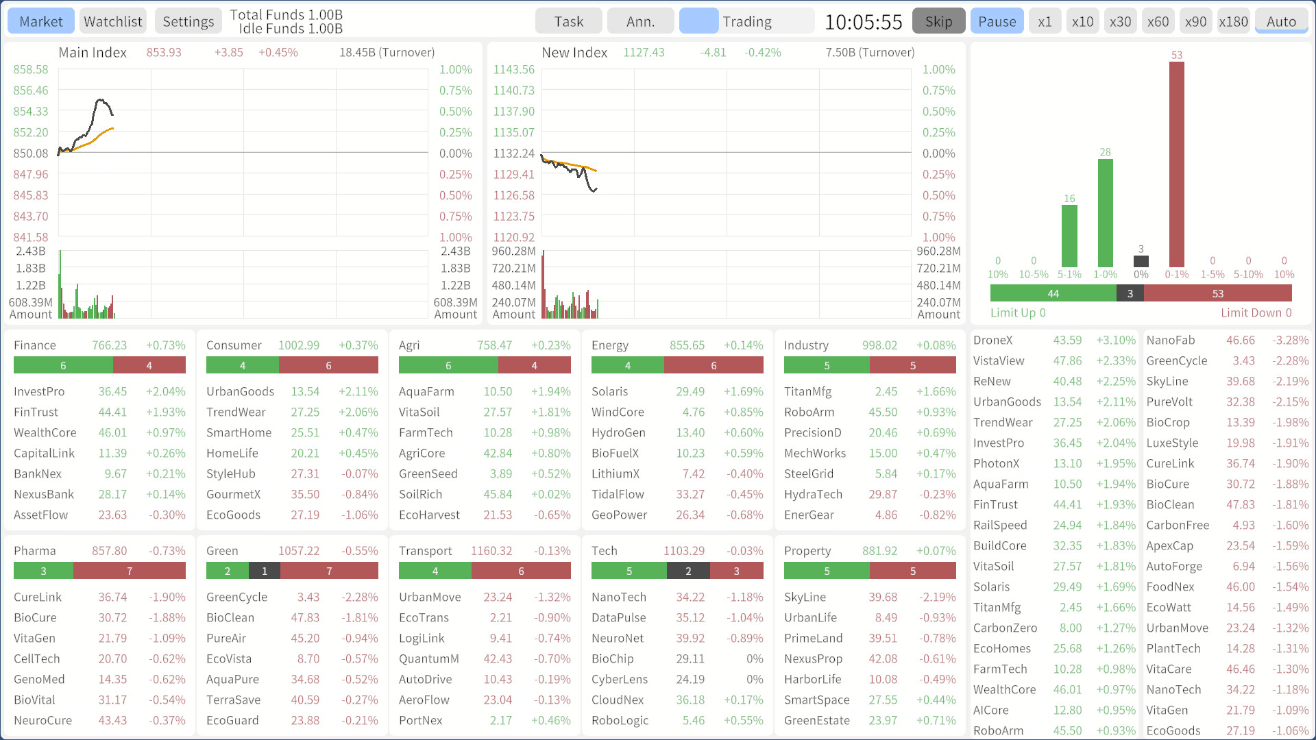 This is a game simulating large capital operations by major players in the stock market. Leverage announcements, market sentiment, and sector hotspots to buy/sell stocks for profit. Will you act as a market maker harvesting retail investors or a hero helping them escape losses?