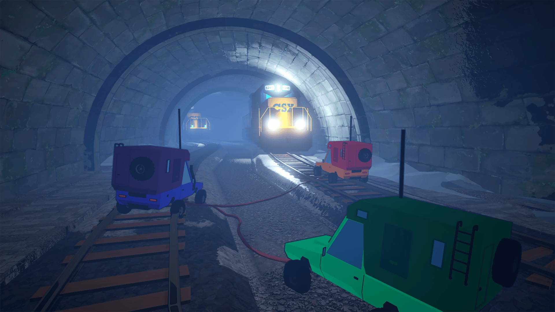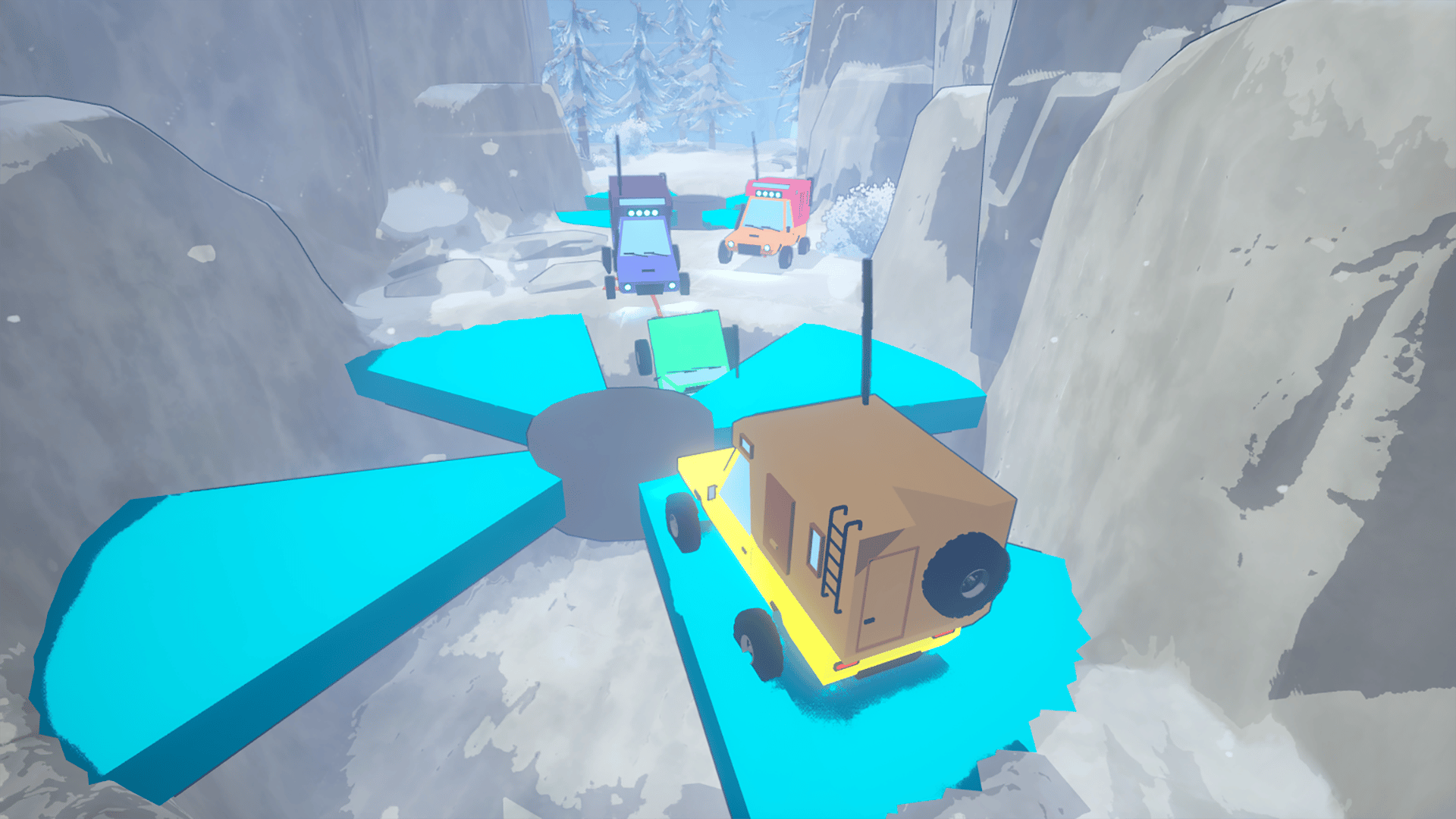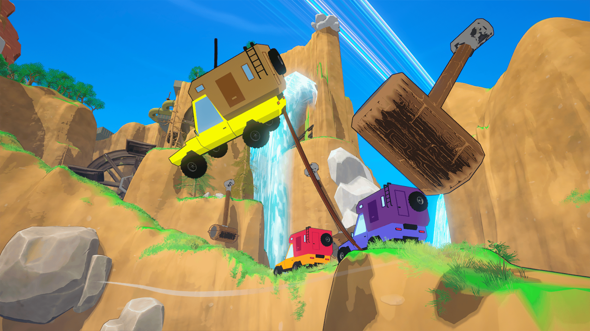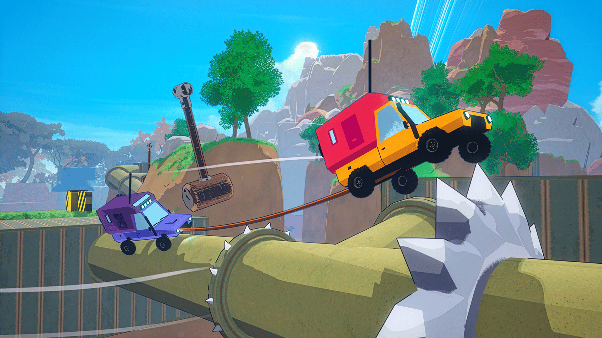 Team up in this chaotic 2-4 player co-op RC car adventure! Navigate dangerous mountain roads while tethered together, pulling each other back from disaster. Climb steep hills, survive wild weather, and reach the top without tumbling into the abyss!