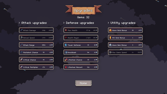 A tower defense roguelite where each defeat makes you stronger. Spend gold on temporary boosts, invest gems in permanent upgrades, and push your tower higher each run.