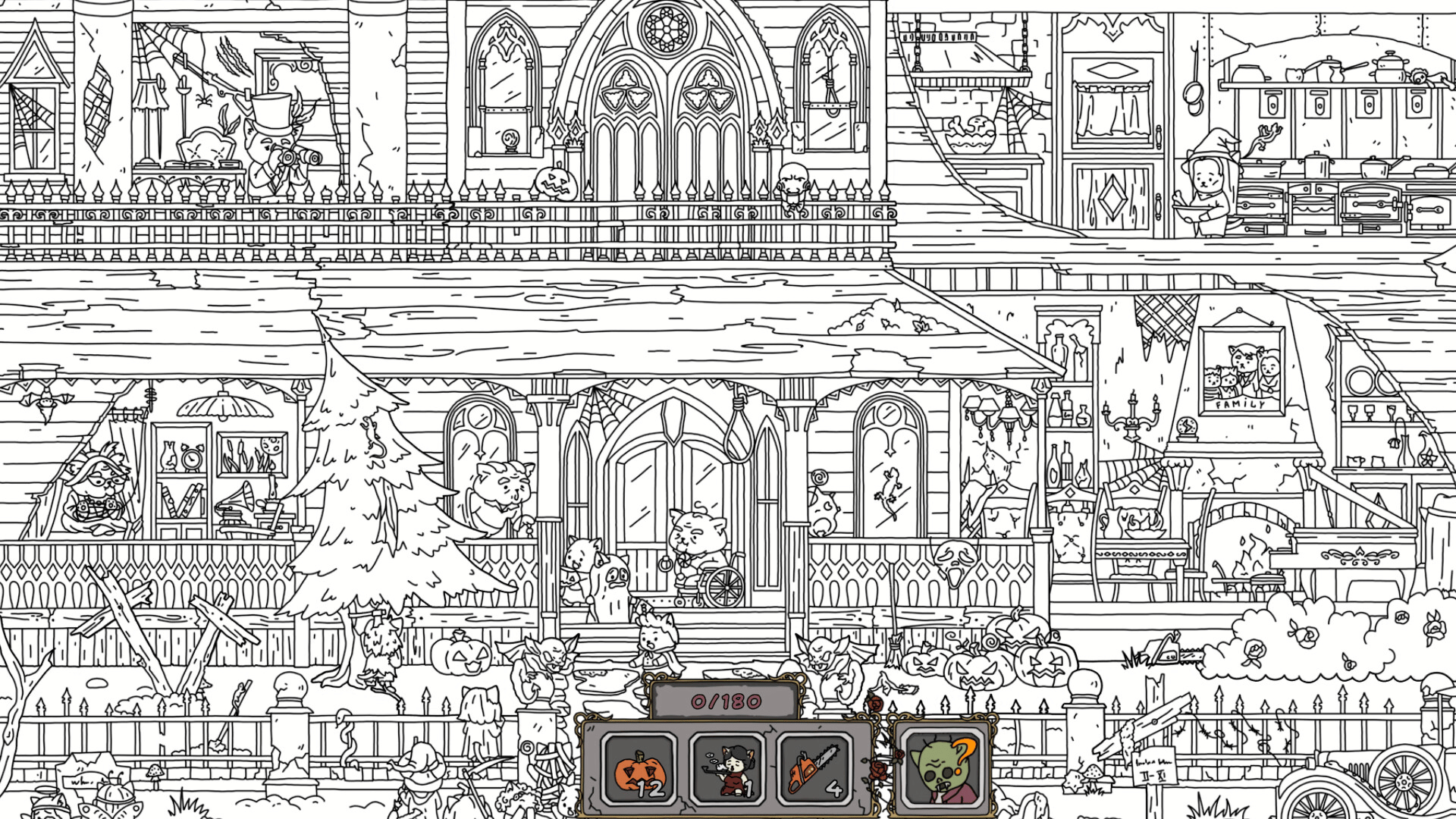 “Trick or treat? ” Test your bravery by exploring a spooky mansion inhabited by ghosts, finding different items, and coloring a black and white picture with colorful inks.