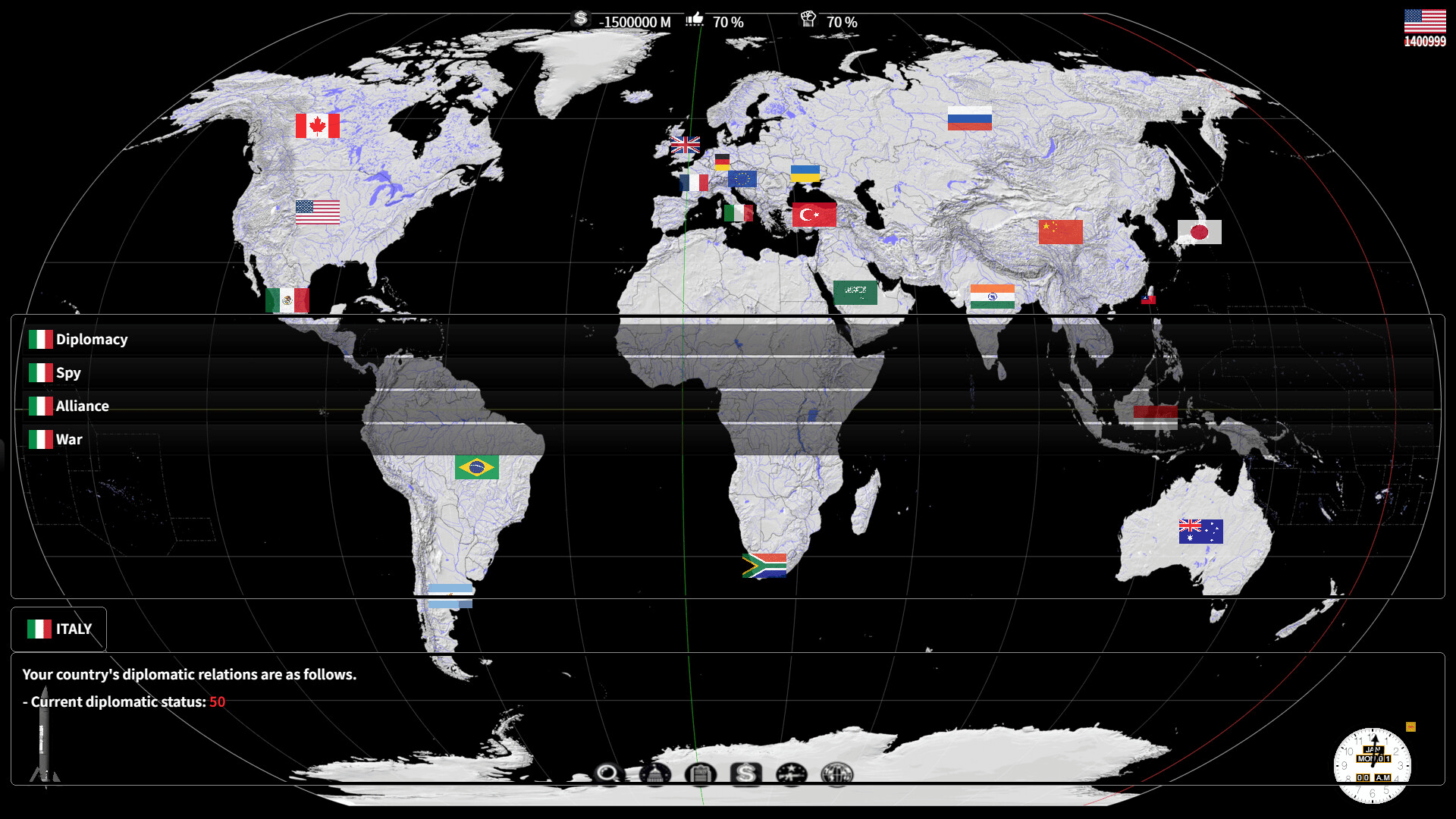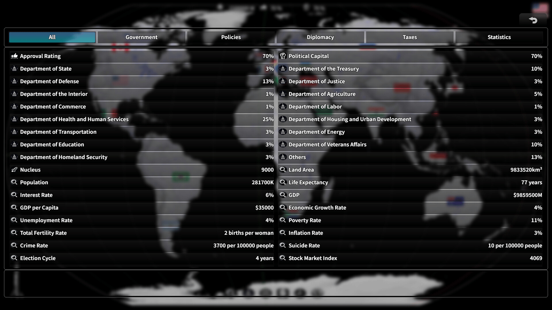 A strategy simulation that combines elements of war and politics. Take on the role of President (or Prime Minister) and govern the nation, managing government, policy, military, diplomacy, taxes. Win elections and achieve victory in war. Turn your beliefs into reality.