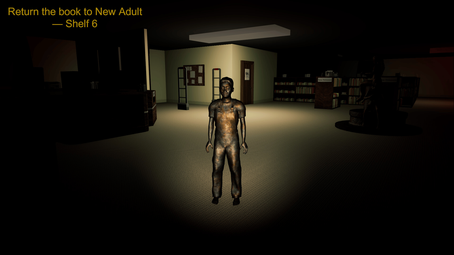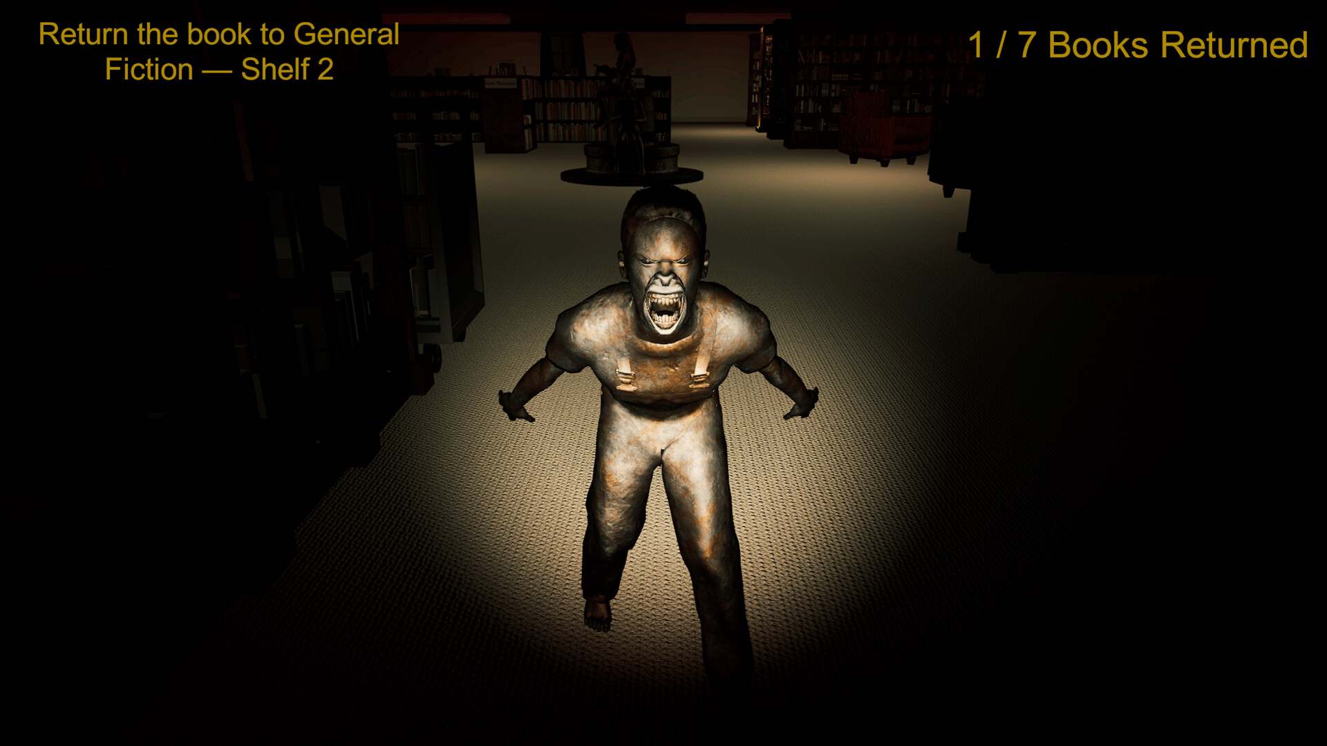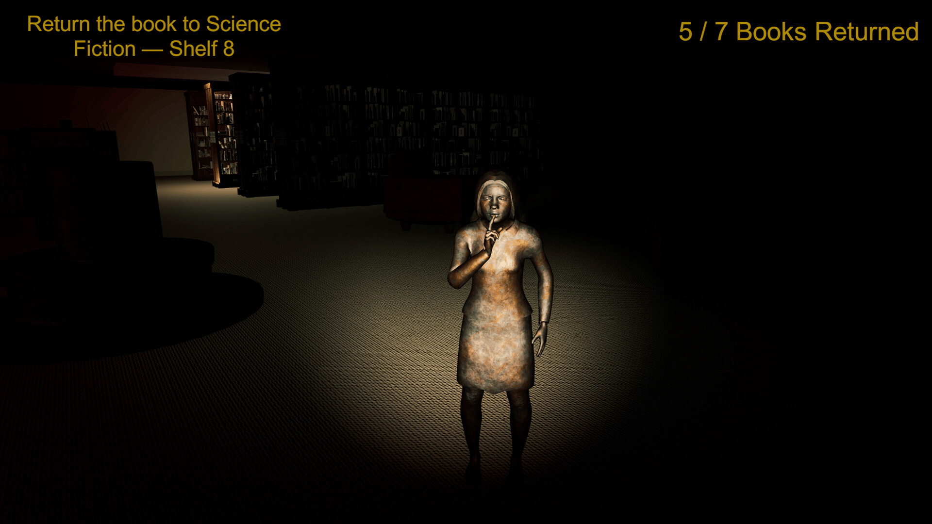 A first-person psychological horror game where you must return seven books to their shelves in a deserted library while being hunted by statue-like entities that only move when unobserved. Survive using observation and strategy in this tense 20-30 minute experience.