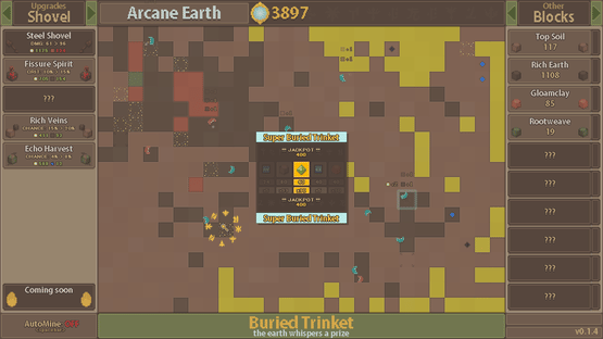 Arcane Earth is an incremental clicker game where you unearth layers of magical terrain to collect essence, blocks and cristals. You can summon Golems and upgrade them to automate digging.
