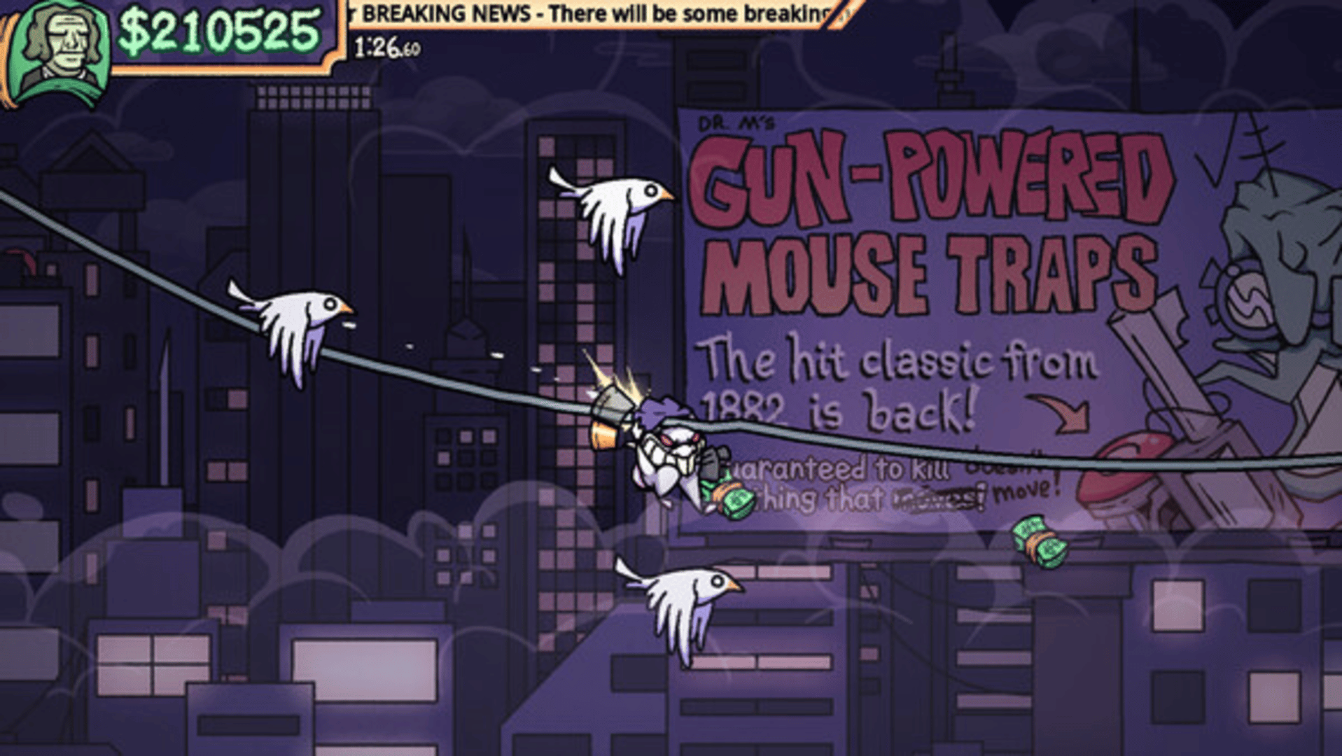 RATSHOT is a slick, fast paced platformer where you use the recoil of your gun to launch yourself through levels. Race through grimy streets and sewers while trying to get the best times and ranks, or play at your own pace and admire the graffiti-covered walls of NYC.