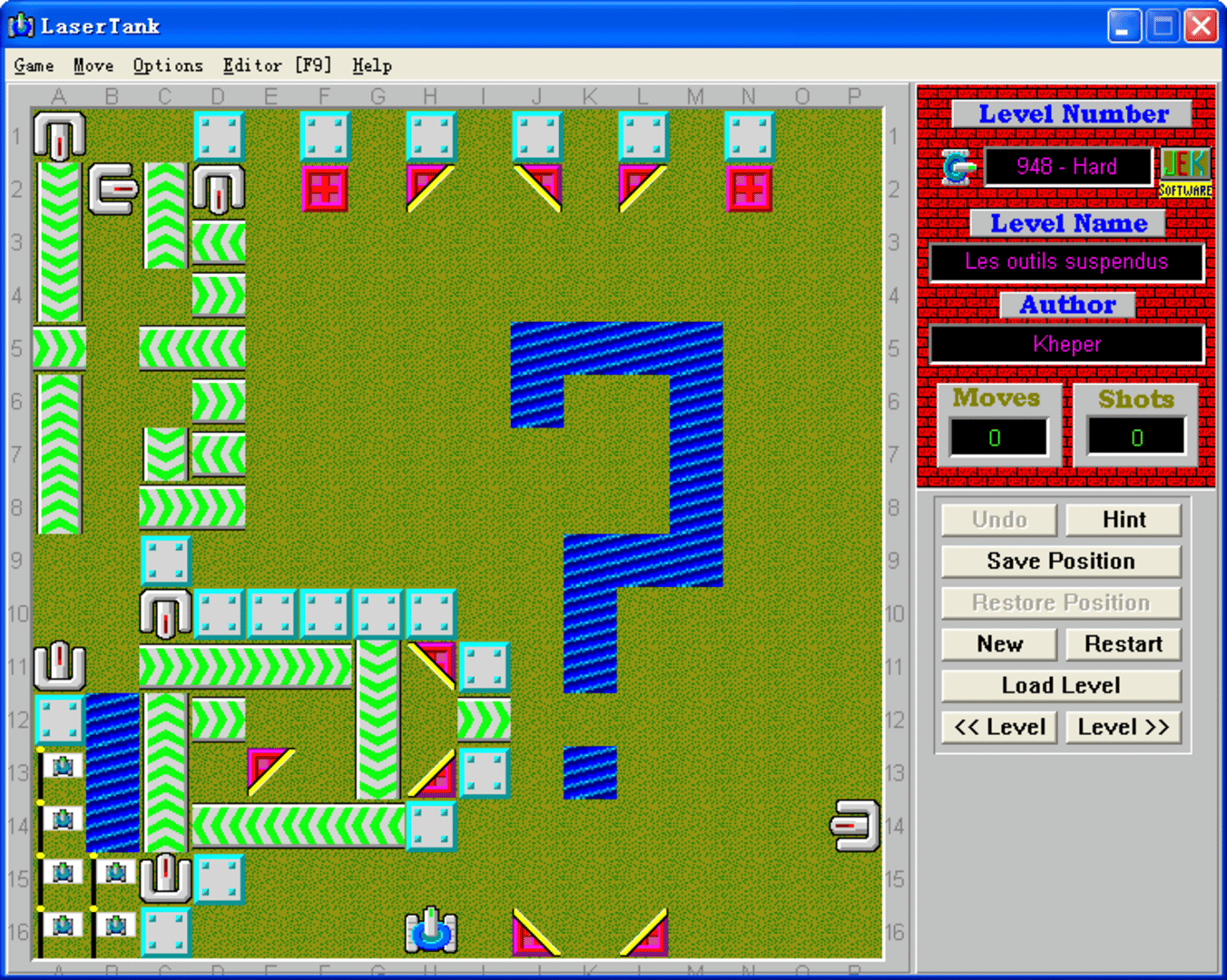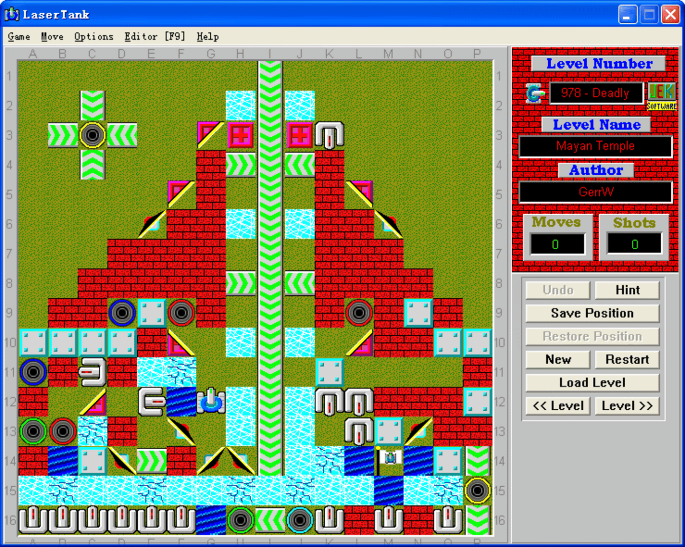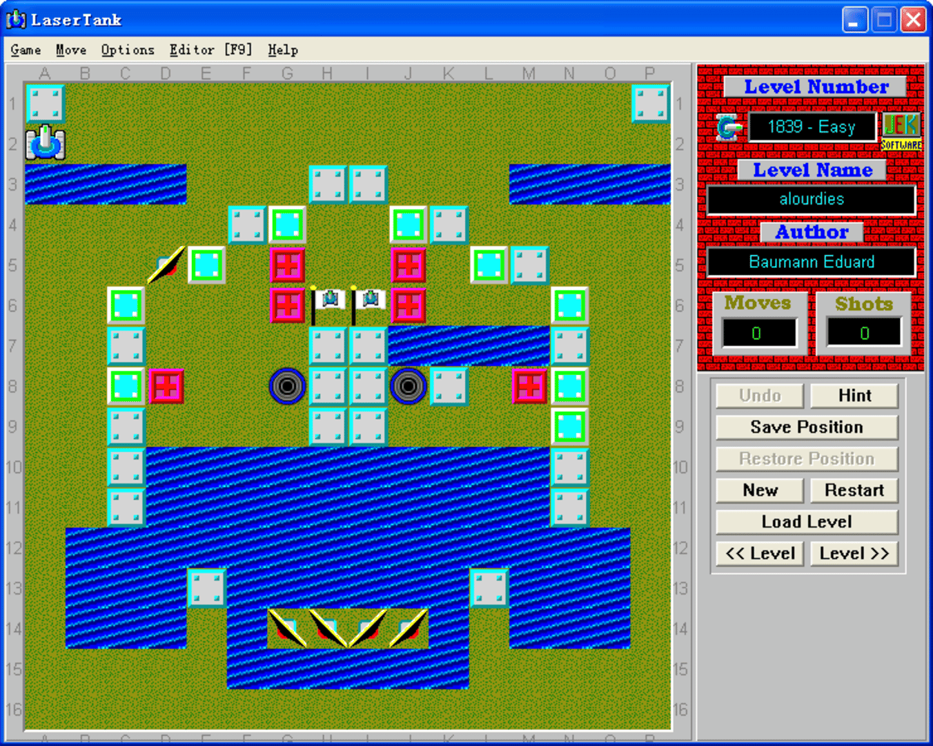 This is a puzzle game. You must get your tank to the flag in every level. Your tank can move in four directions and can fire a laser that is used to move objects. The amount of moves and shots it takes to complete a level are recorded in a high score list. The scores are then compared with the current "Global High Score" file. You can get a current copy of the Global High Score file on LaserTank web site. If you beat one of the scores by making less moves to finish the level, then send me an e-mail with your "LaserTank.hs" file attached. I will update the website with your score; however, you will have to prove your score by recording the level and sending me the playback file [.LPB file]. Also, don't forget to rate the unrated levels you solve. You can use the LaserTank Level's Evaluator tool to do it.