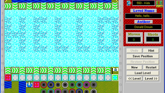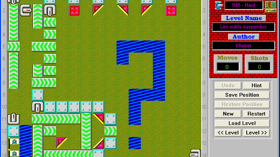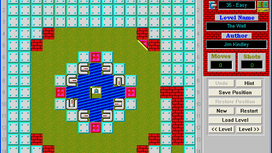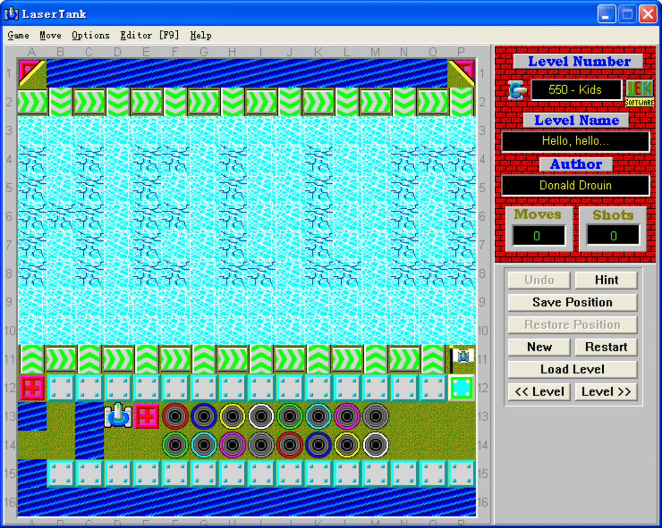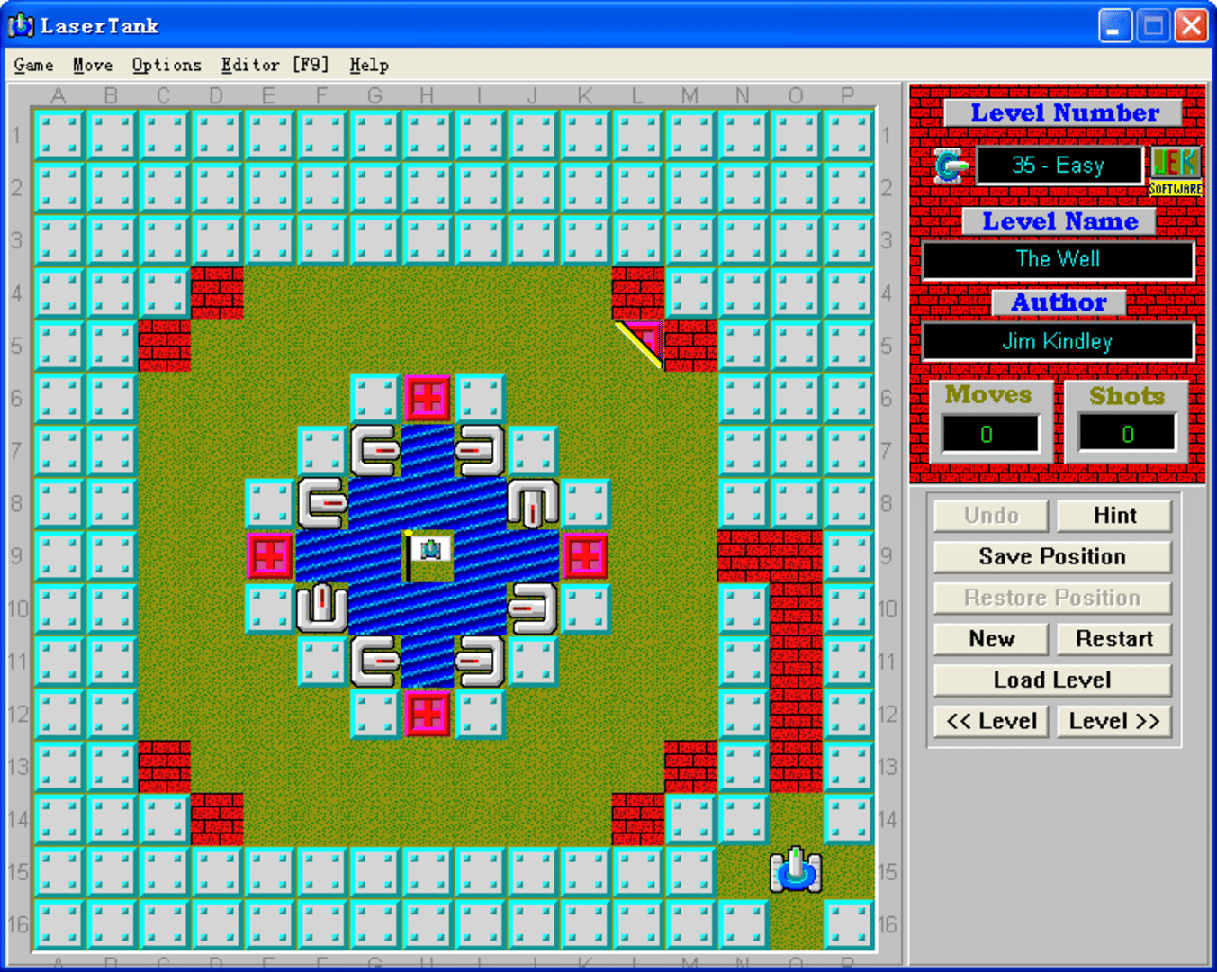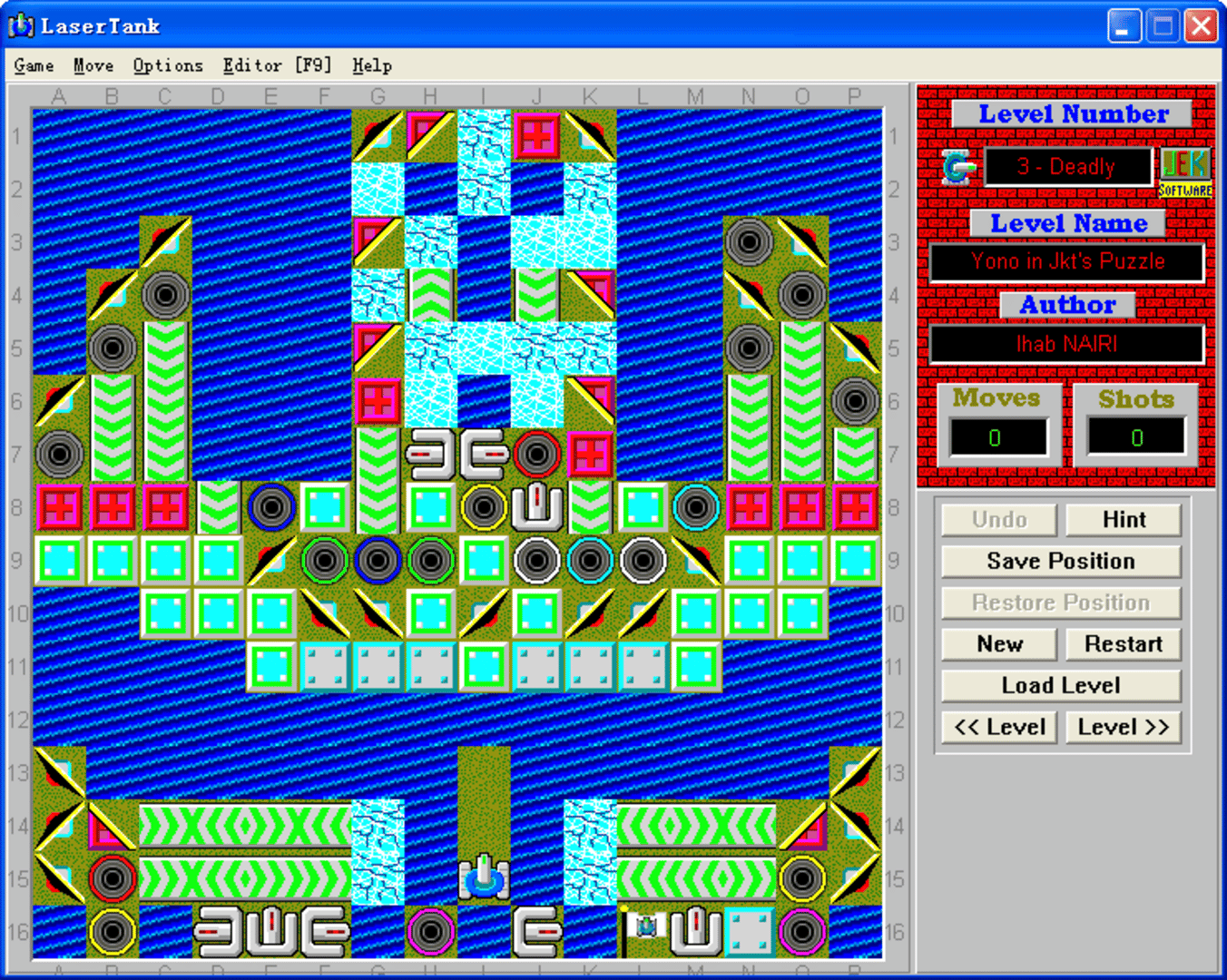 This is a puzzle game. You must get your tank to the flag in every level. Your tank can move in four directions and can fire a laser that is used to move objects. The amount of moves and shots it takes to complete a level are recorded in a high score list. The scores are then compared with the current "Global High Score" file. You can get a current copy of the Global High Score file on LaserTank web site. If you beat one of the scores by making less moves to finish the level, then send me an e-mail with your "LaserTank.hs" file attached. I will update the website with your score; however, you will have to prove your score by recording the level and sending me the playback file [.LPB file]. Also, don't forget to rate the unrated levels you solve. You can use the LaserTank Level's Evaluator tool to do it.