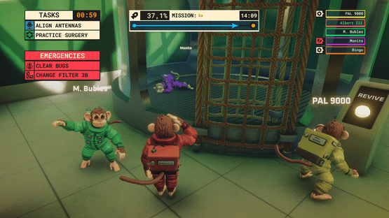 Go Ape Ship! is a frantic co-op multiplayer game for one to eight players. Work with your crew of daring Astrochimps to master an expanding collection of tasks, respond to emergencies, unlock new rooms and upgrades for your spaceship, and safely reach the stars. Survive together. Or not at all.