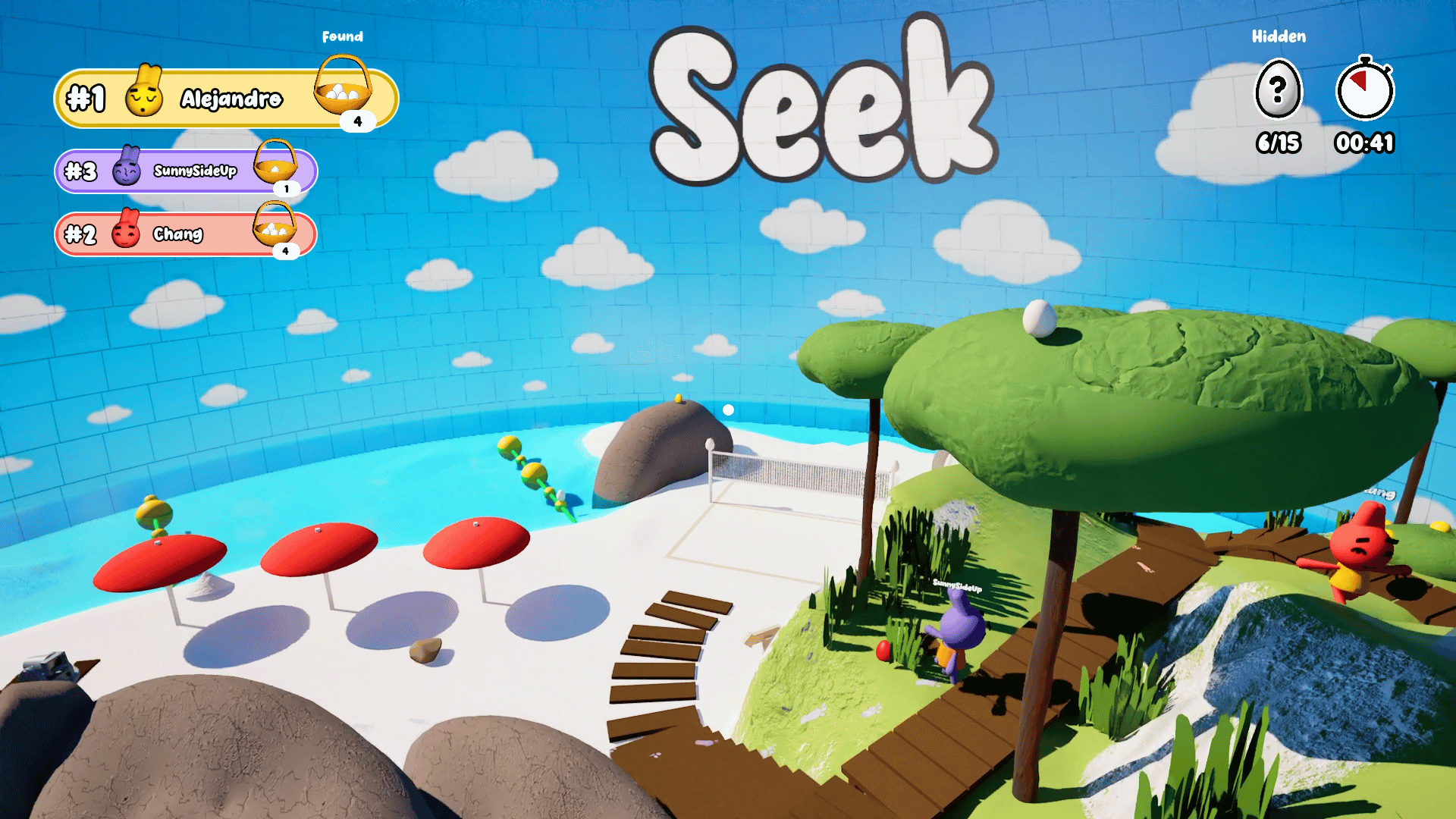 Hop & Seek is a multiplayer egg hunt game set in a game show for Easter bunnies. You can hide eggs, seek eggs and trick your friends.