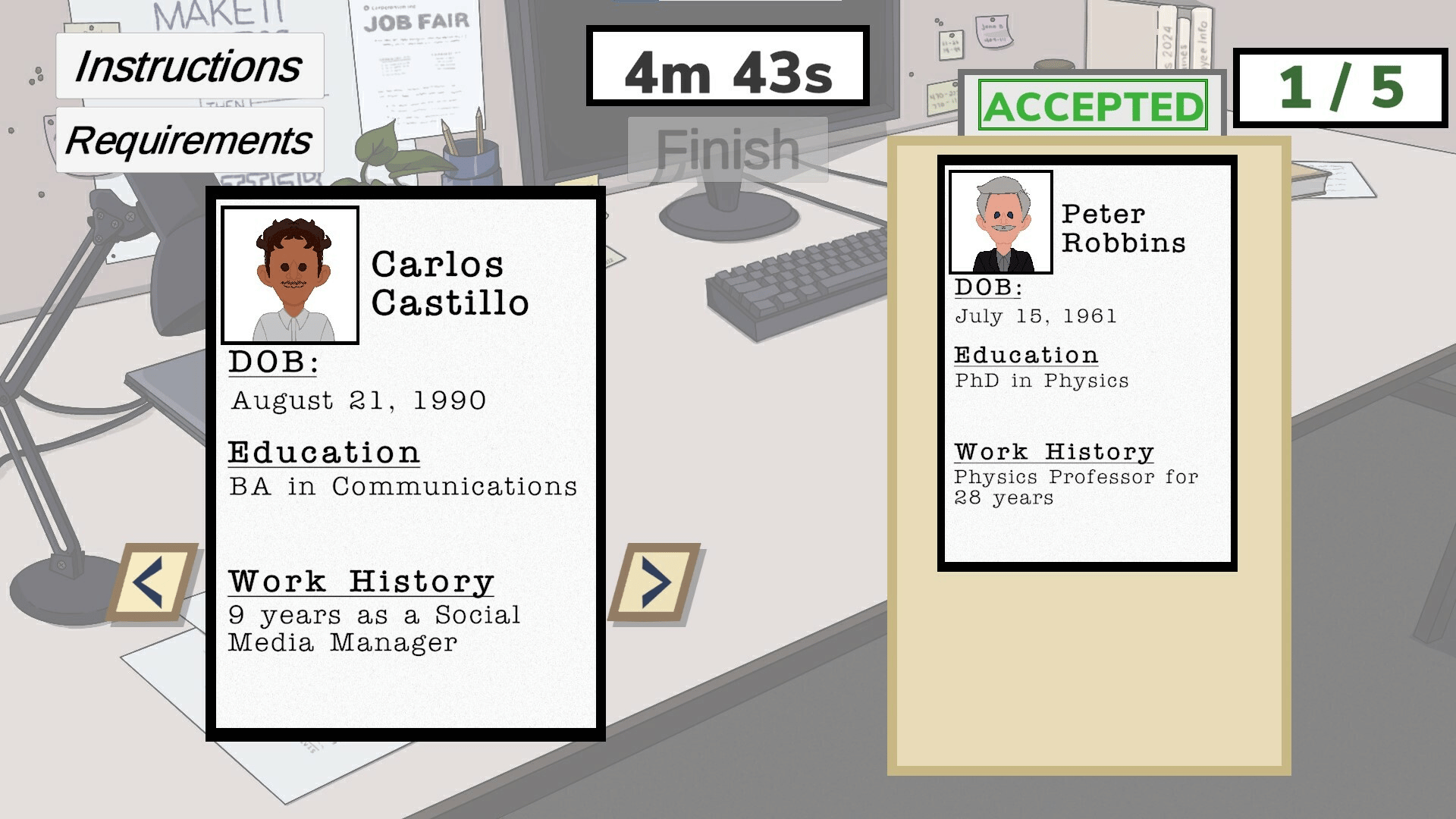 Newly hired for a revitalization program, work against a ticking clock and navigate a skeptical boss, a lousy friend, and discrimination while making hiring decisions. Interactive narrative with timed decisions Critical thinking Prosocial Empathy