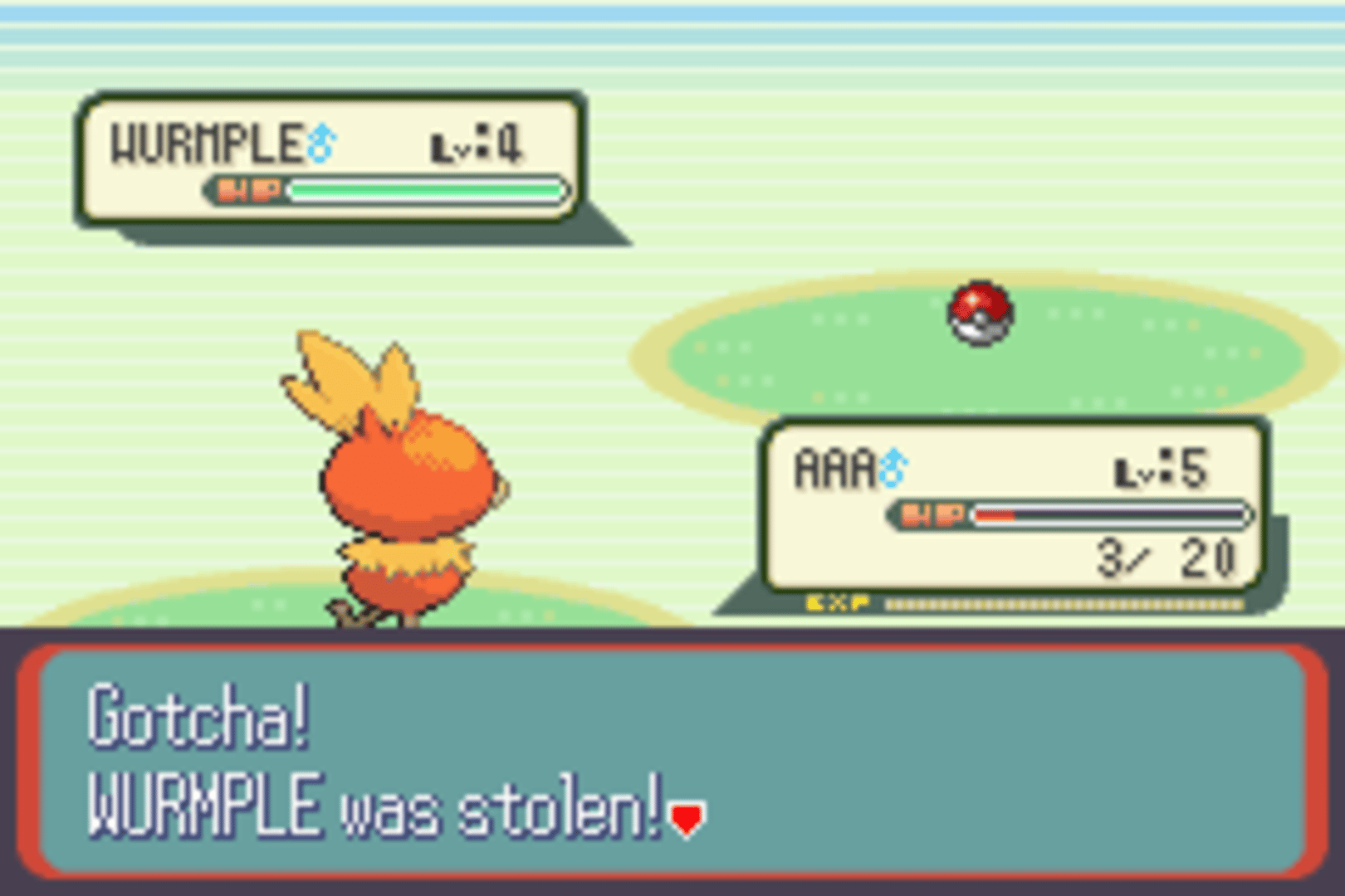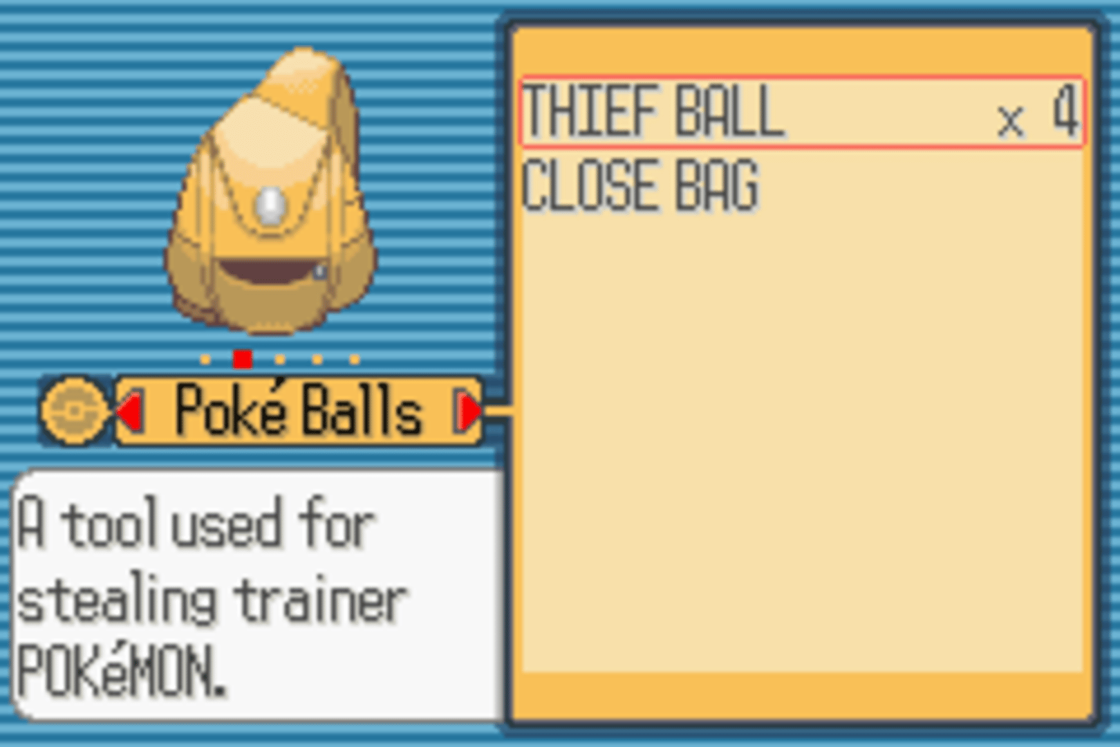 Play through the original Rubystory with a twist--you can steal trainers' Pokémon. This project was made using the the pokeruby decompilation project, and its source code can be found here: https://github.com/huderlem/pokeruby-thief Rules: 1. Poke Balls, Great Balls, and Ultra Balls are now named Thief Balls, Robber Balls, and Burglar Balls. 2. You can capture trainers' Pokémon using those balls. (Stealing is not allowed in Double Battles.) 3. You cannot capture wild Pokémon. 4. Your Pokémon do not gain experience.