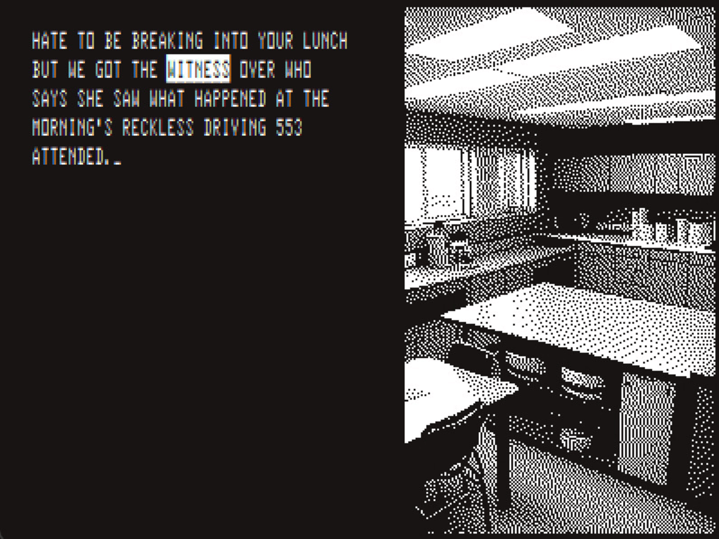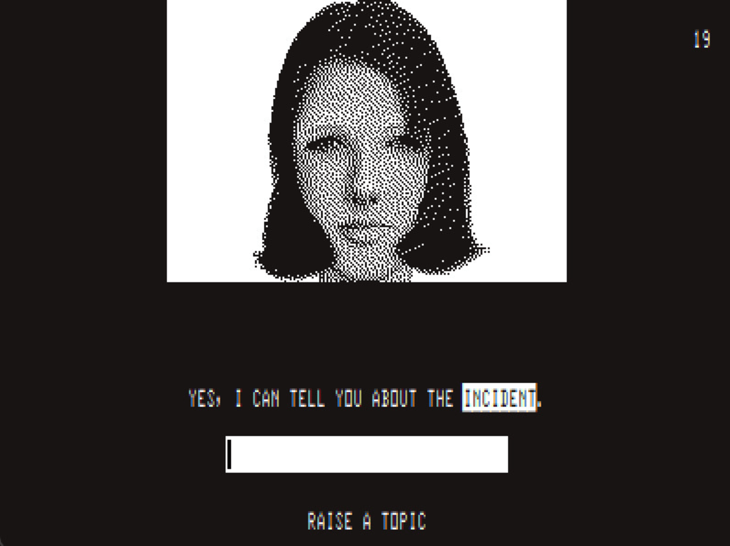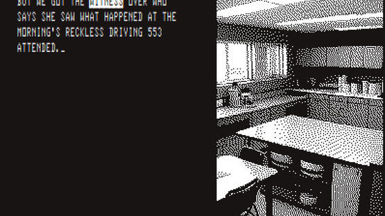 An experimental text-based police interrogation game, in which the player questions a suspect and witness following a car accident. The game is designed to resemble the terminal of a computer from 1985.