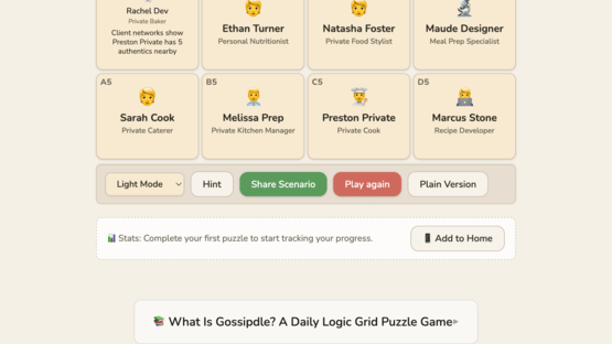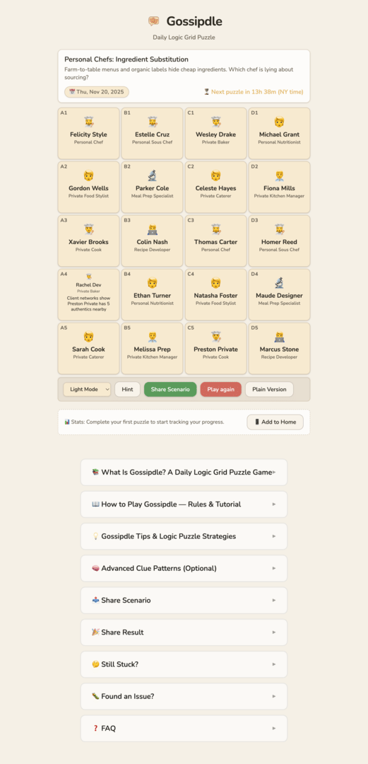 Gossipdle is a daily logic grid puzzle game inspired by Einstein's Riddle. Each day features a new puzzle with entertaining gossipy themes - from workplace drama to celebrity scandals. Use deduction to match people, objects, and clues. Share your results Wordle-style and compete with friends!