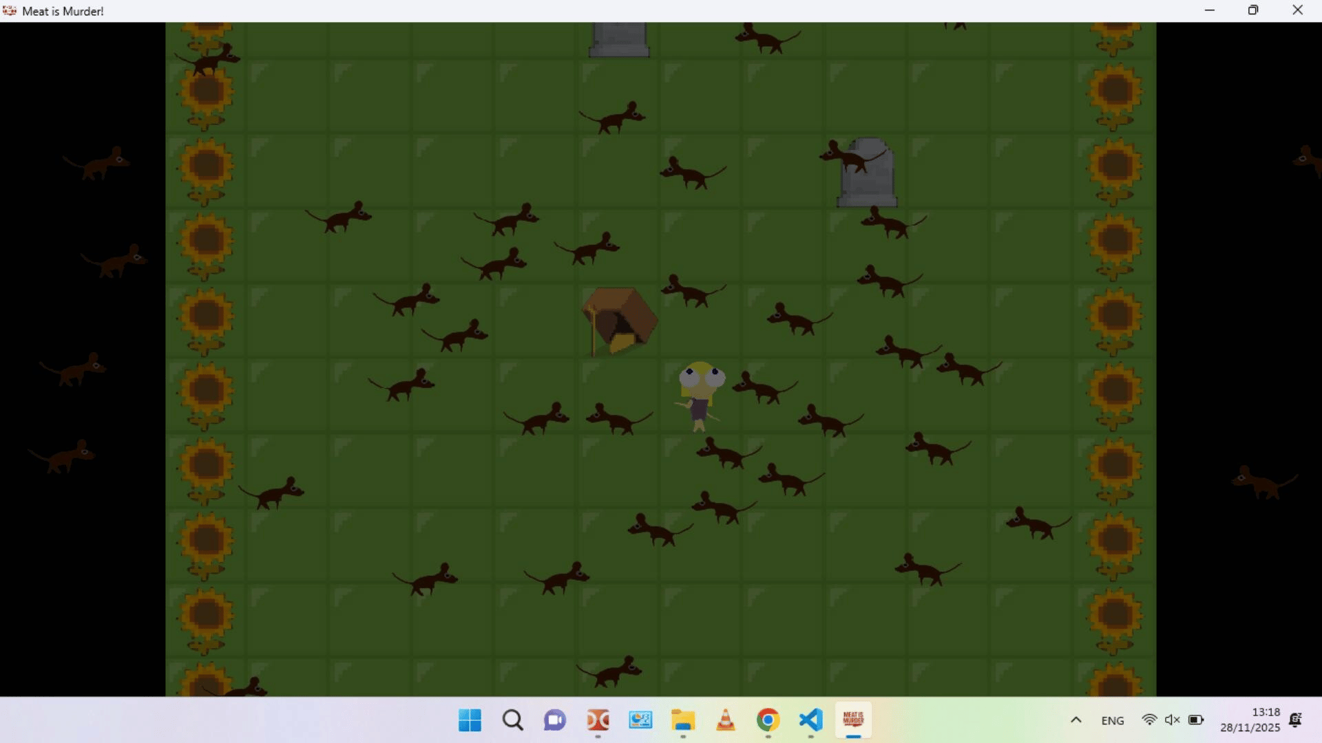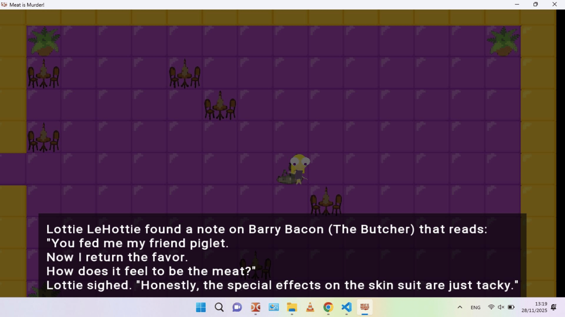 A top-down survival horror game, with procedurally generated maps, where eating meat heals you... but every bite makes the vegan serial-killer faster.