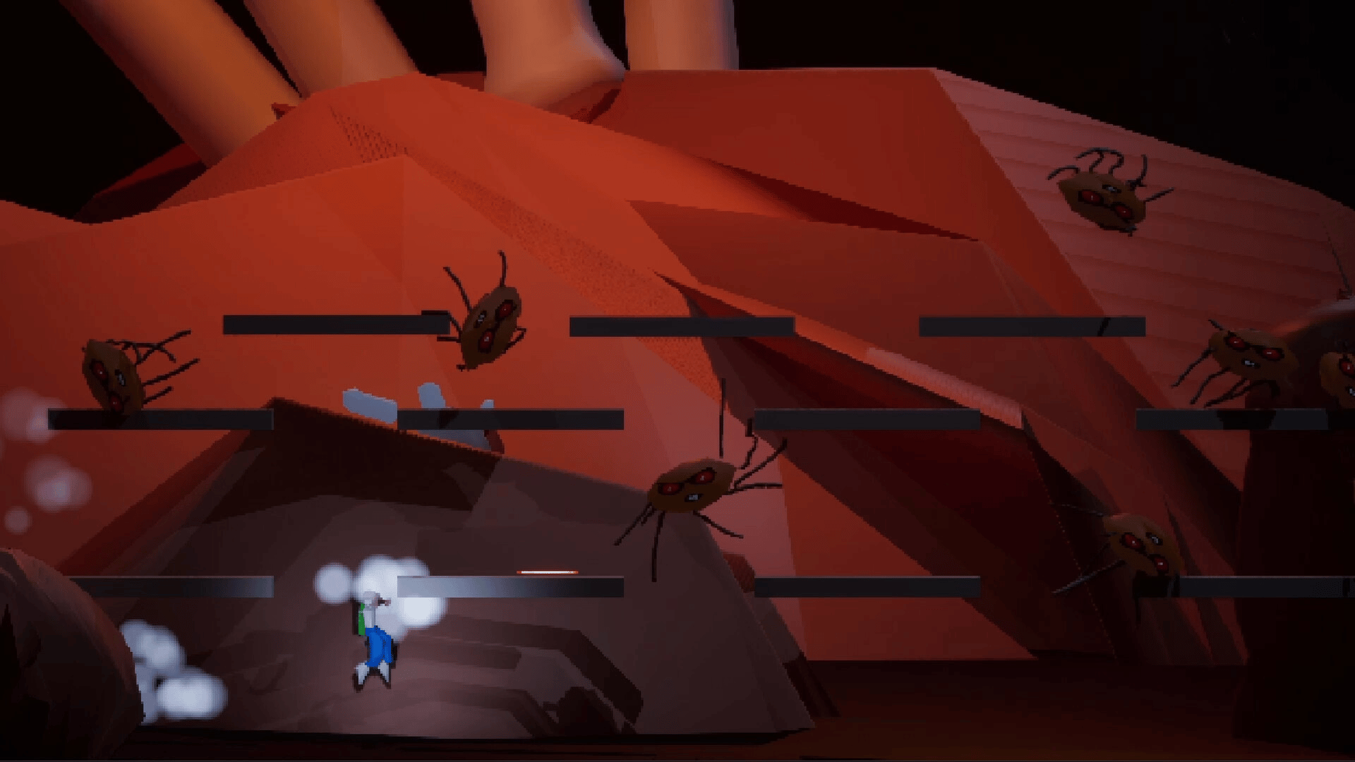 As a temporarily microscopic person in a shrinking robot sphere, swing with your grappling hook up your lead singer's colossal body and invade different parts of his body to shoot the spiders infesting him, in this bold mix of 3d Physics Platformer and 2d Shoot'em'up.