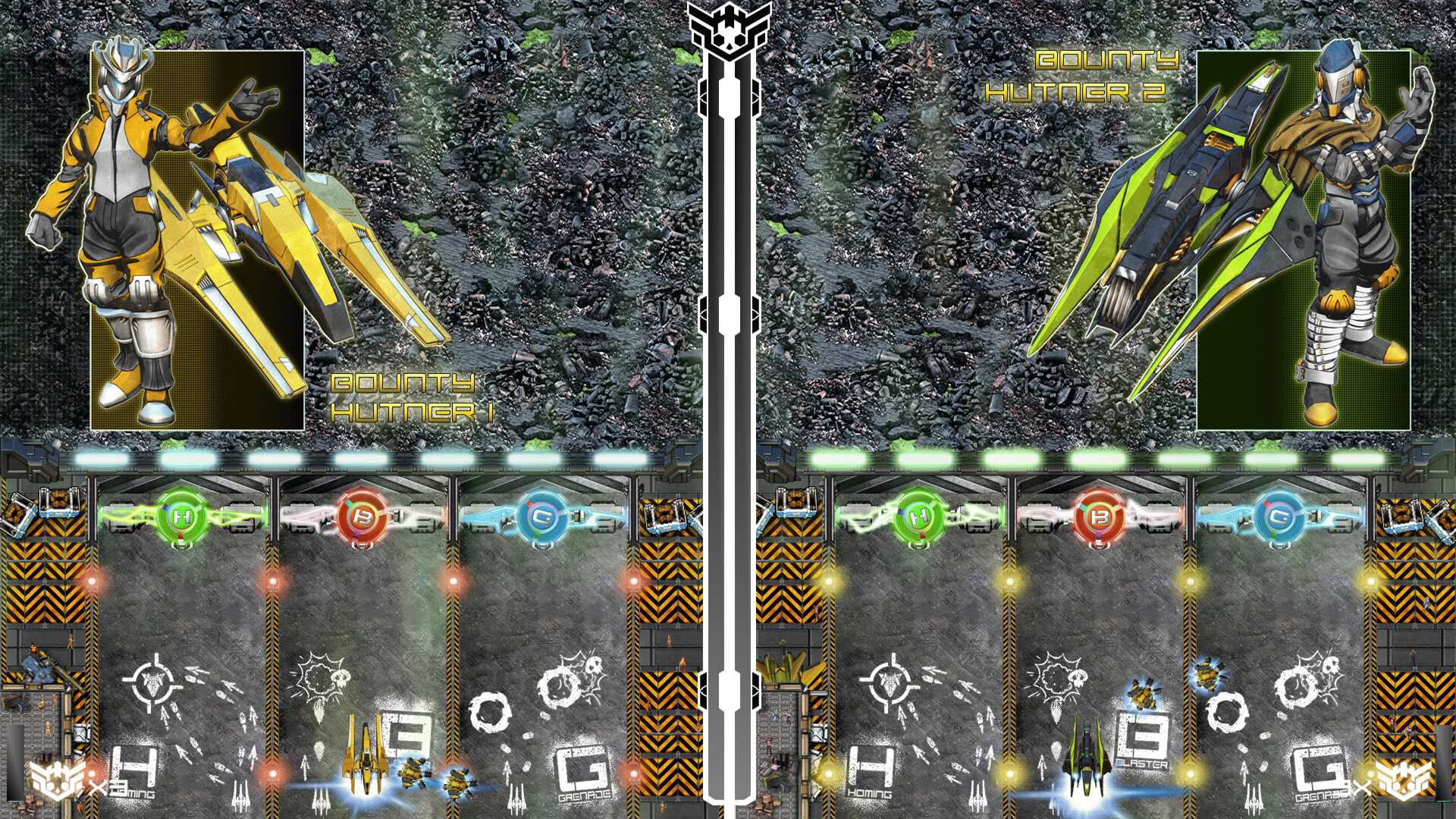 Hotwing Hellions is a high-octane, 2 player couch competitive arcade shooter set in a lawless space-western universe. You and a rival bounty hunter race through hostile fleets, dodge swarms of bullets, and take down massive bosses as you blast through stages in split-screen chaos.