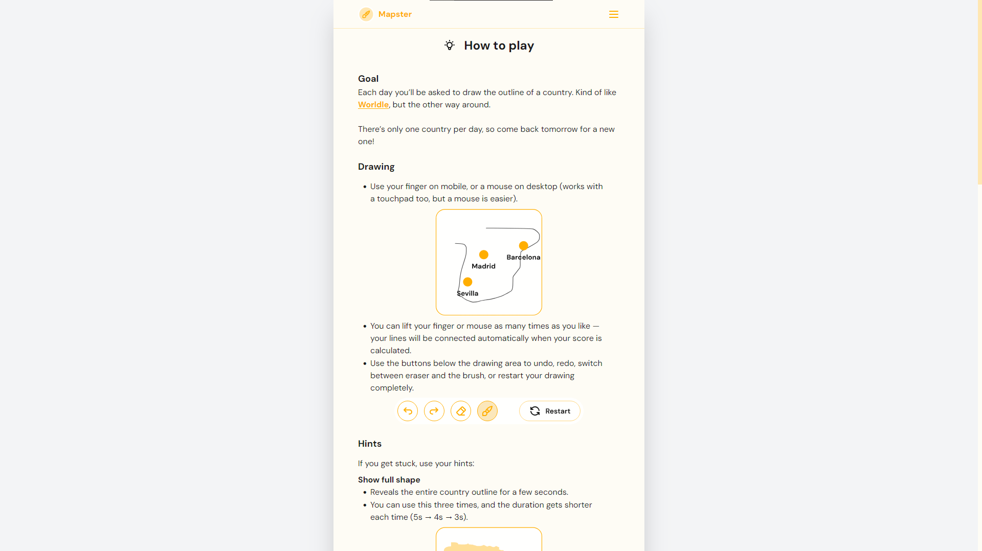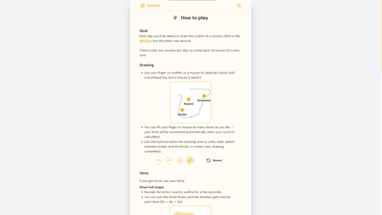Test your mapmaking skills — draw country maps from scratch! Each day you’ll be asked to draw the outline of a country. Kind of like Worldle, but the other way around. There’s only one country per day, so come back tomorrow for a new one!