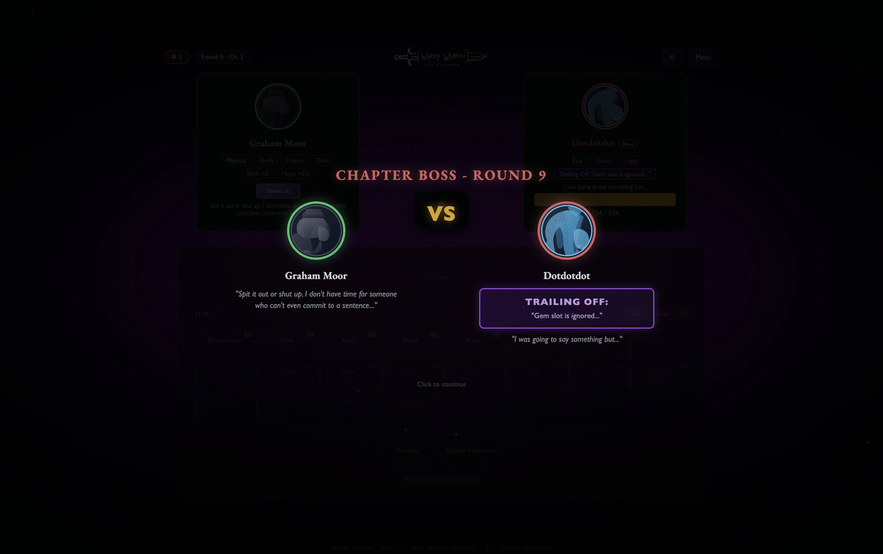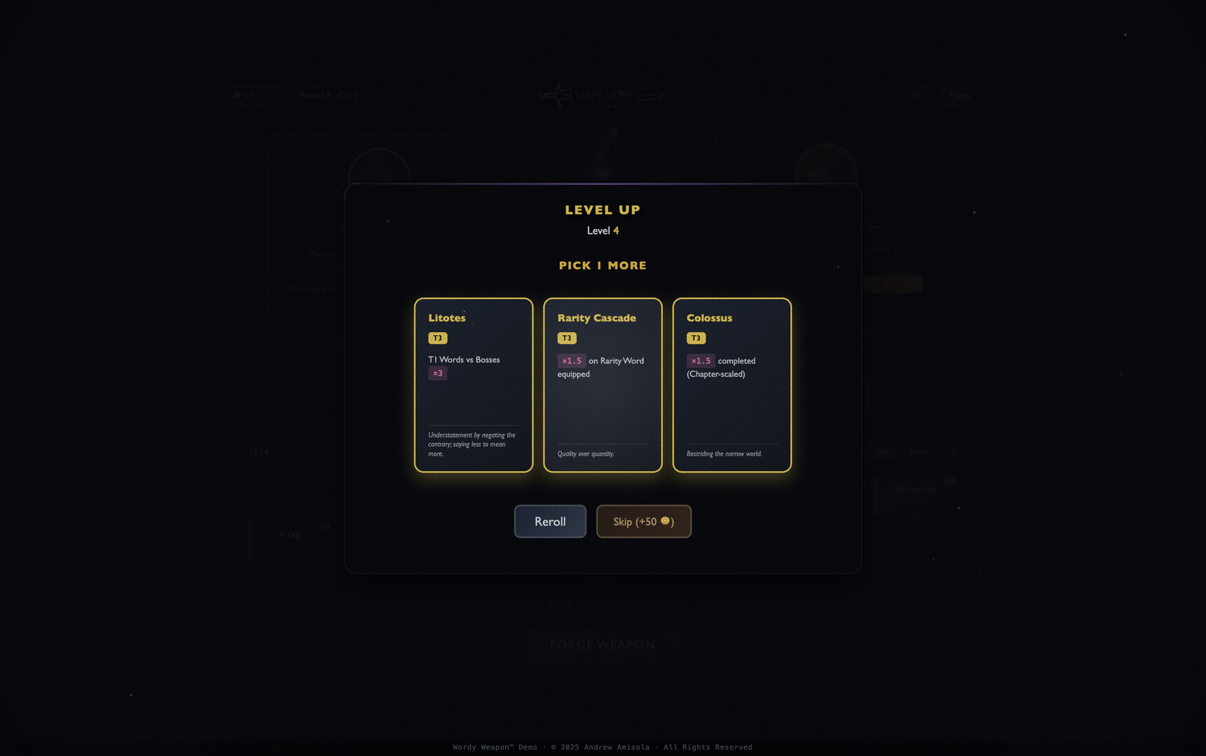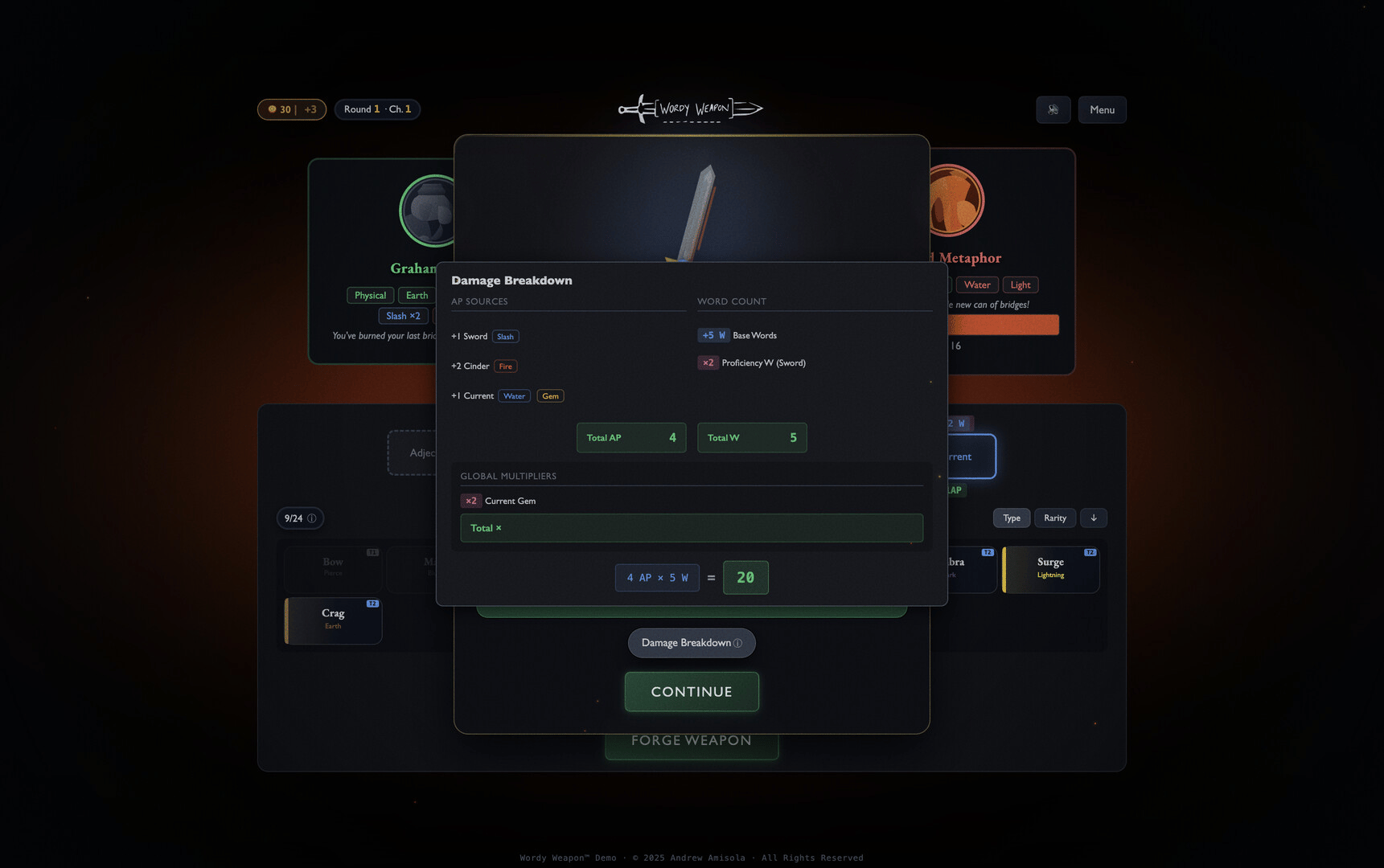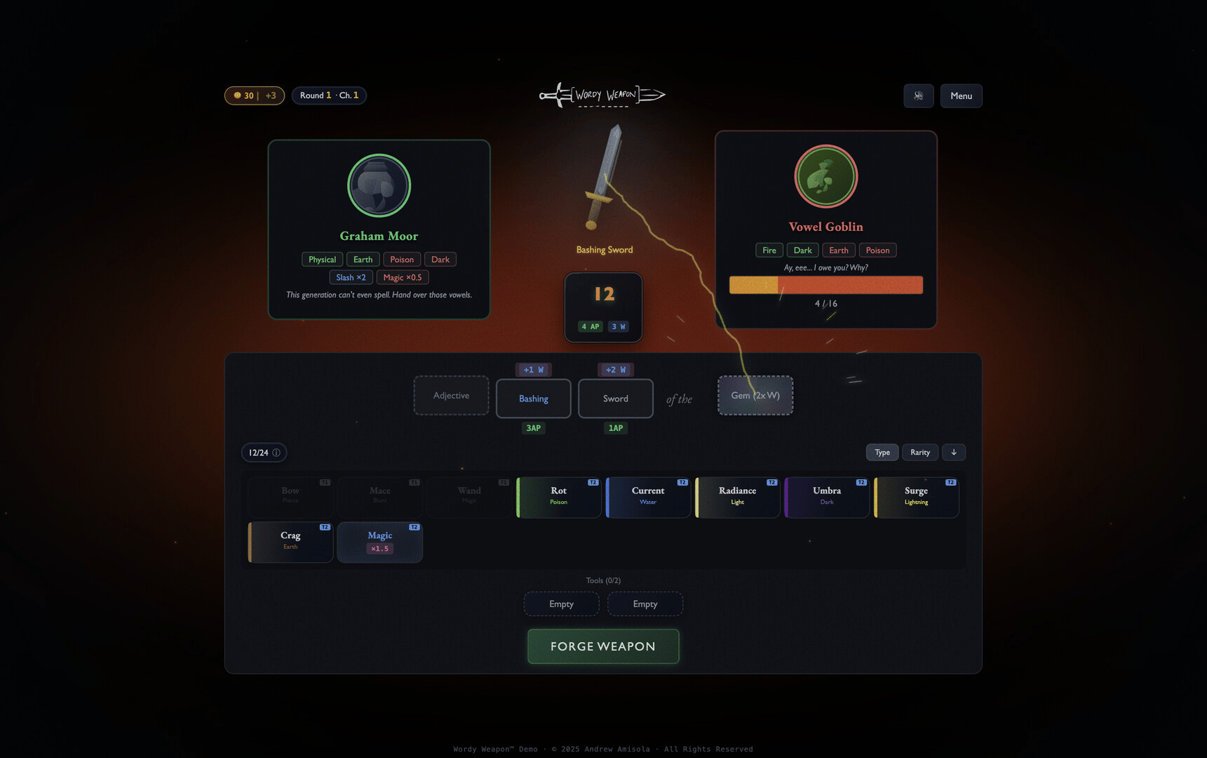 A word-crafting roguelite! As the Wordsmith, fill in the blanks with Adjectives & Nouns to forge ridiculous weapons with RPG-style names and defeat your enemies.