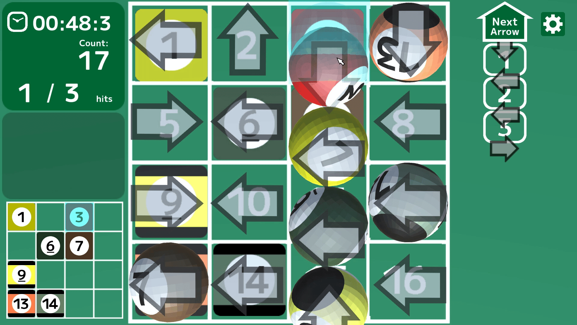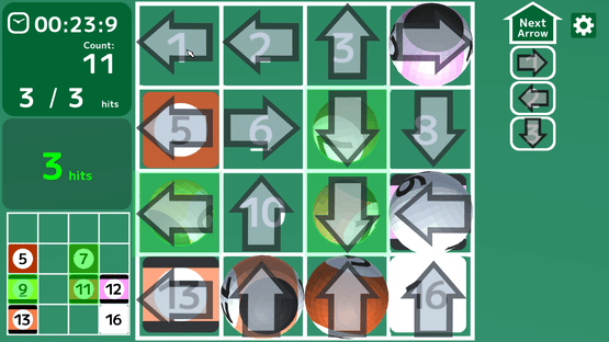 "Touch the arrow to slide the balls together, leading to One Away, then Bingo!" Touch the arrow to slide an entire line in its direction. You guide the balls to the matching color and pattern sheets and make them reach the goal, line them up to get Bingo, and sink them.