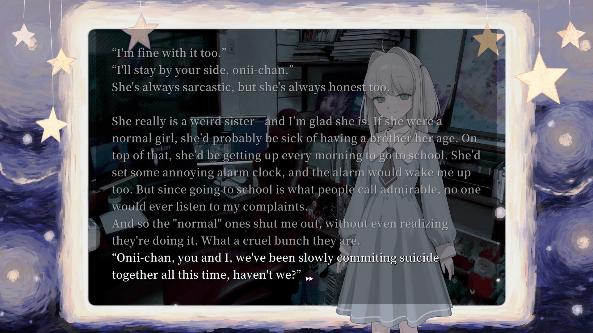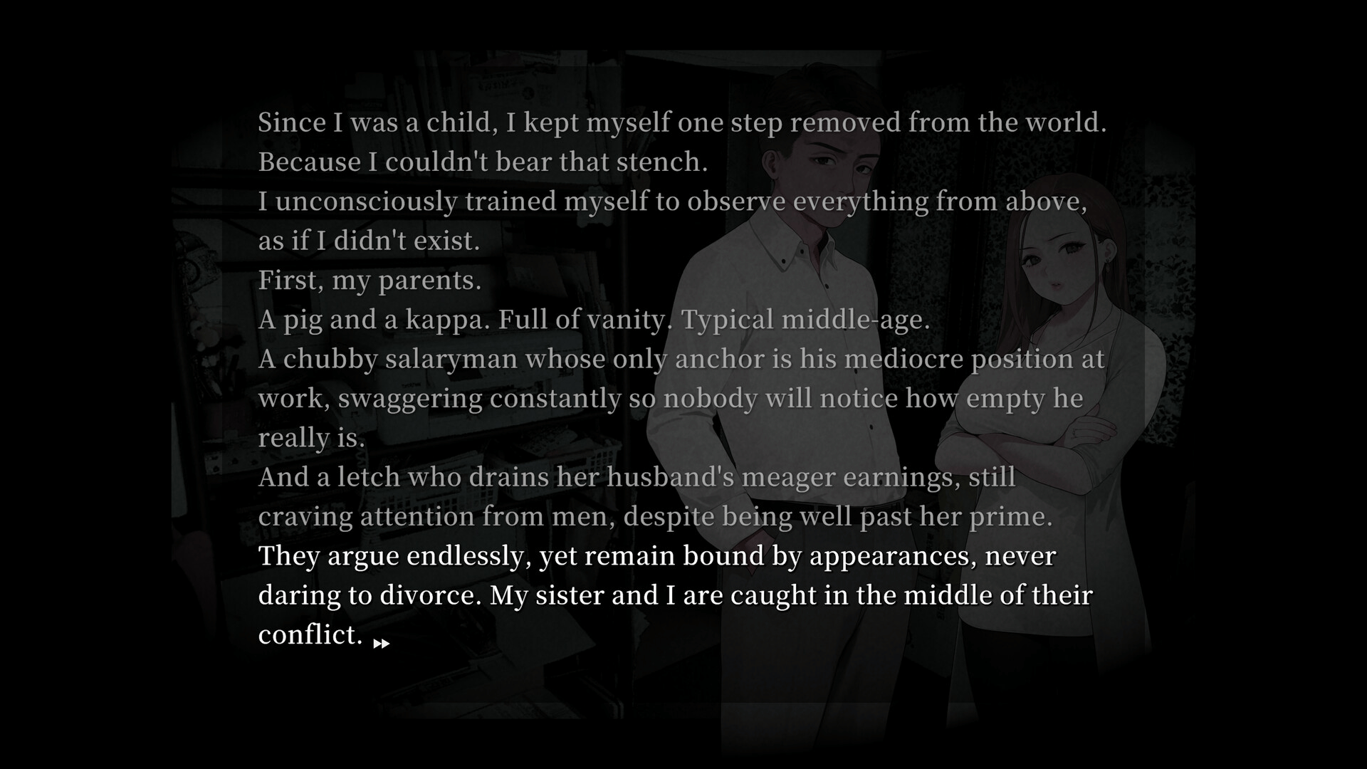 A dark visual novel created by the team behind NEEDY GIRL OVERDOSE. Overly sensitive to other people's emotions, the protagonist—a light novel writer—develops the ability to read minds, only to be driven even deeper into isolation. His sole remaining comfort is his younger sister, gifted yet lonely.
