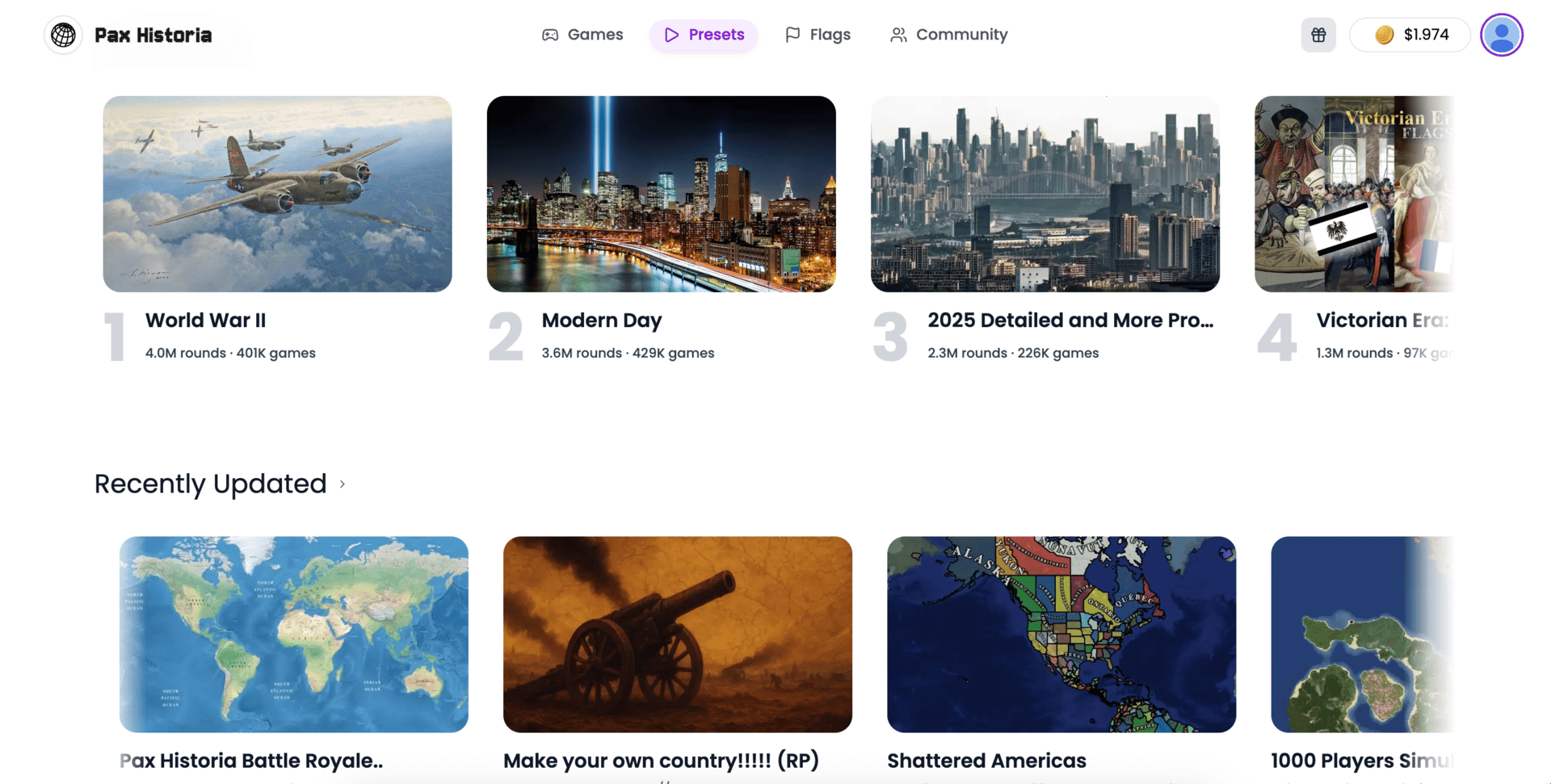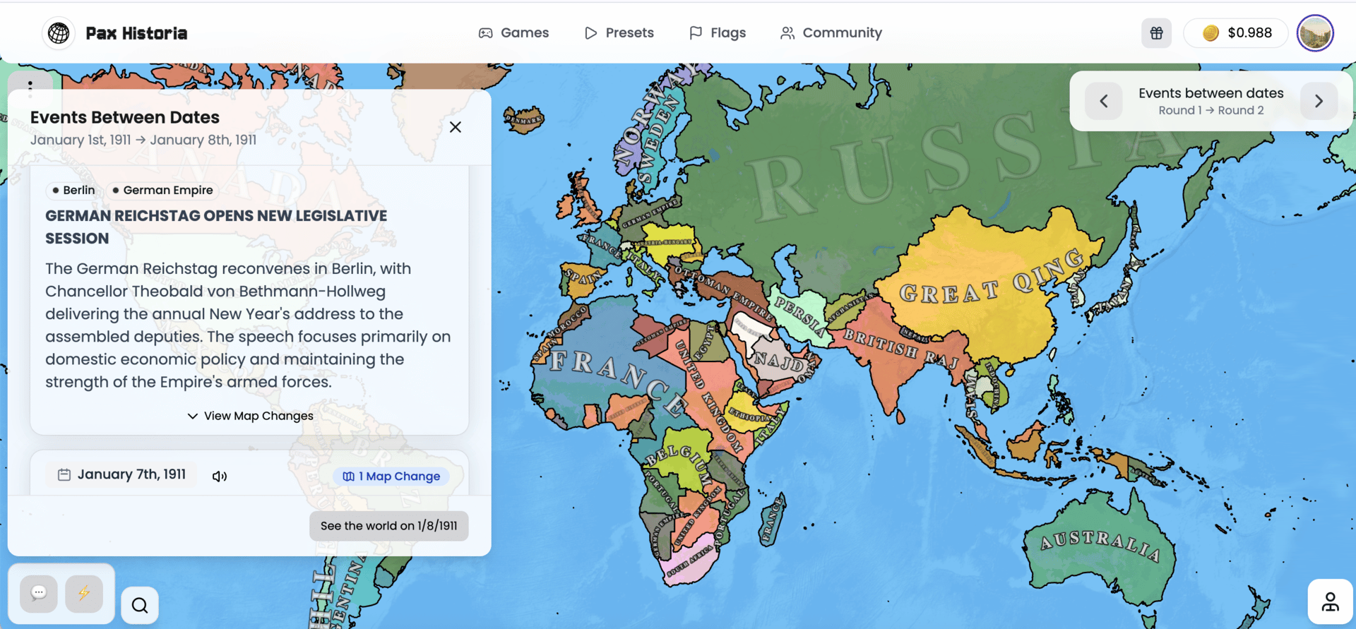Pax Historia is an alternate-history sandbox game where players choose a country, a moment in time, and rewrite the course of history with the help of generative AI. What if Rome never fell? What if the Soviet Union survived? What if Genghis Khan ruled for another generation? We go beyond history, too. What if aliens invaded Earth? What if you were a college dropout creating a tech startup? The ability to create, edit, and copy custom maps, actors, historical context, and more means that users can play nearly any scenario they can imagine