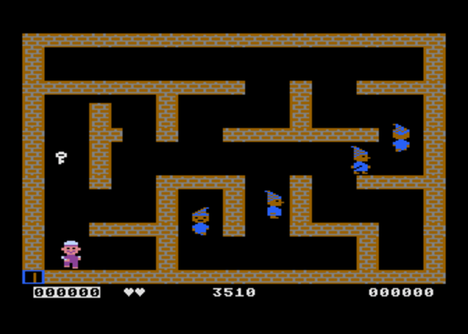 Abracadabra is a simple arcade game starring a young wizard who has to collect keys in the maze-filled wizard’s castle while using a projectile spell to vanquish different enemies such as snakes and elves. One of the features of the environment are the constantly changing walls, ie the individual blocks of the walls change their position as you make your way through. There is also a time limit, failing to exit a room under the given time results in an untimely death. A two-player option is available where two players can take turns and see who collects the highest amount of points.