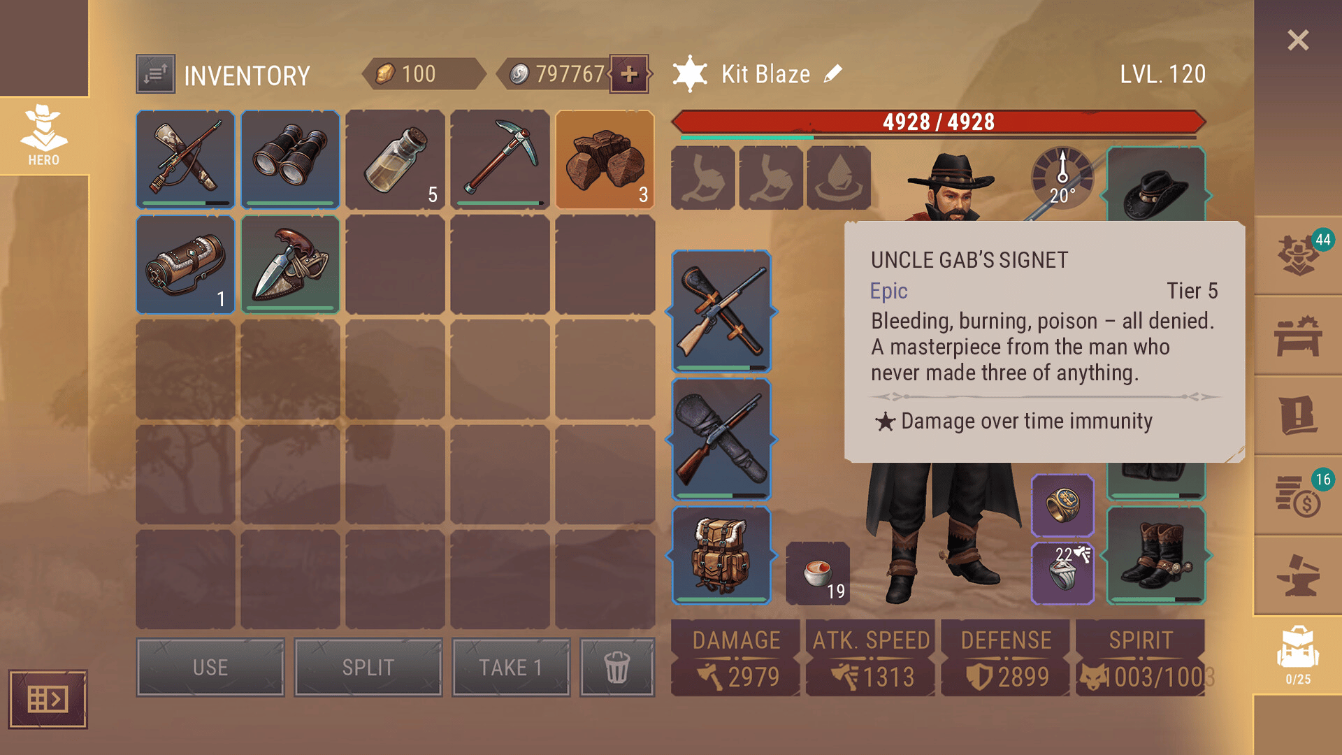 From the dusty trails to the wild frontier, Uncle Gabe’s Signet keeps you standing in the toughest fights. This unique one-of-a-kind ring shields you from poison, bleeding, and burning—turning the tide against both ruthless outlaws and wild beasts.