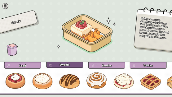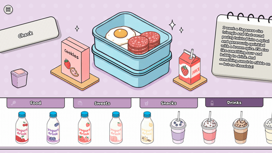 Pack my LunchBox is a cute and relaxing puzzle game where you assemble lunchboxes based on customer wishes. Read the cards, consider their likes and dislikes, and choose the perfect meal, drink, and snack. Meet all the conditions to clear the level!