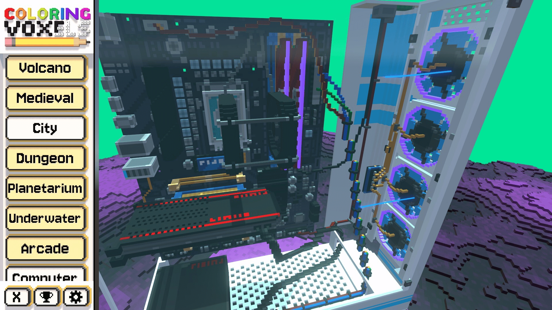This Computer-themed world unlocks 16 additional levels for Coloring Voxels. Each level is a computer part or peripheral to build a Computer, piece by piece!