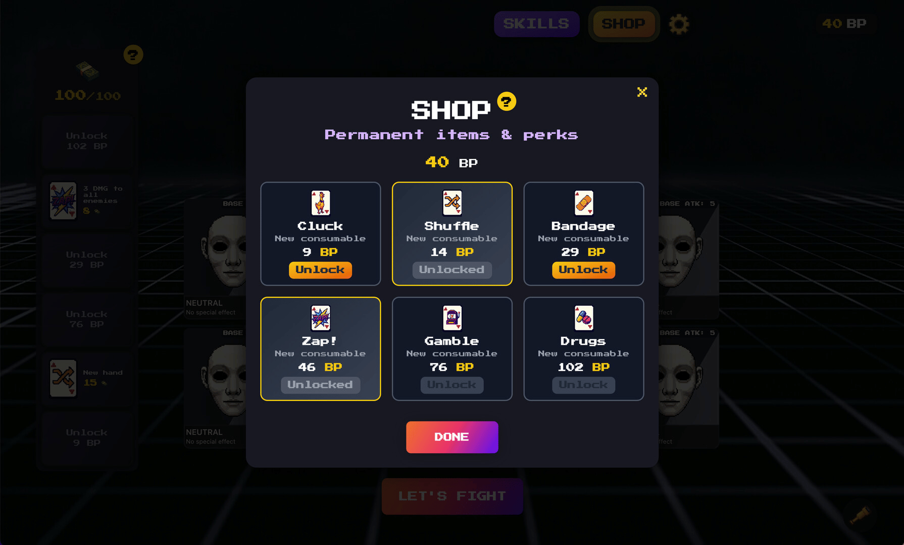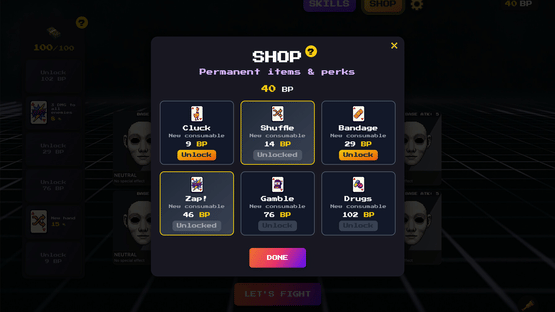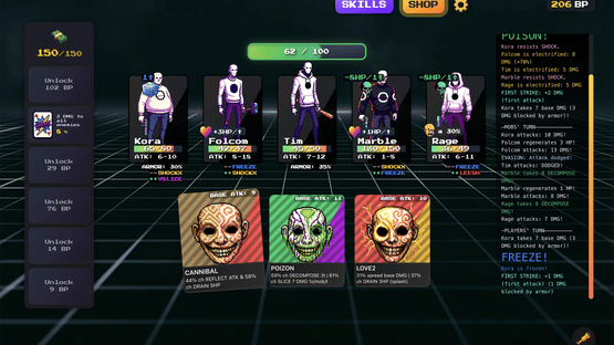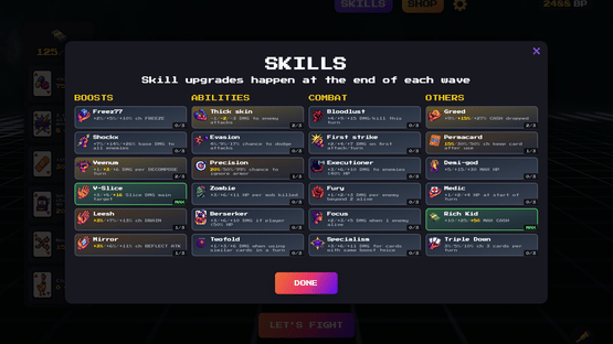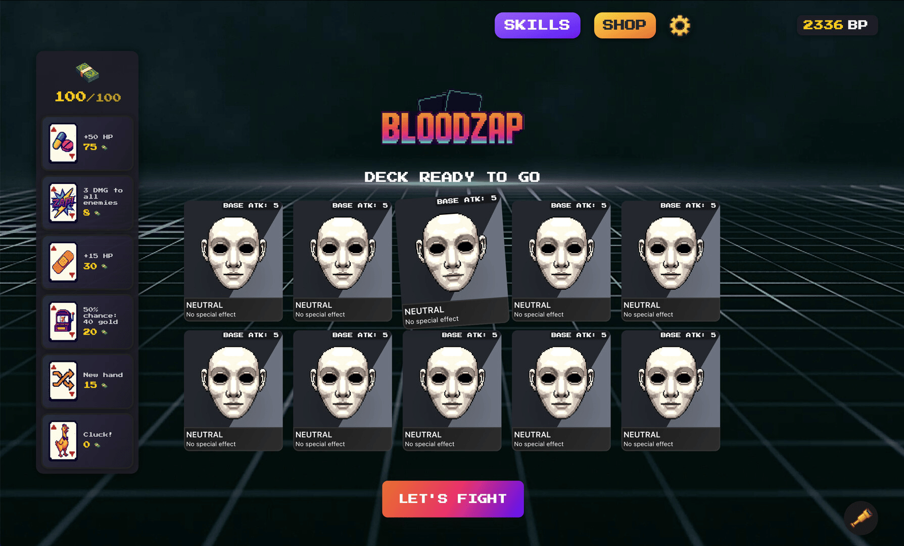 Battle waves of enemies in a tactical card battler. Combine neutral cards with boosts to create powerful attacks. Spend XP on permanent shop upgrades and use in-run skill points to adapt your strategy. A passion project from Void65.