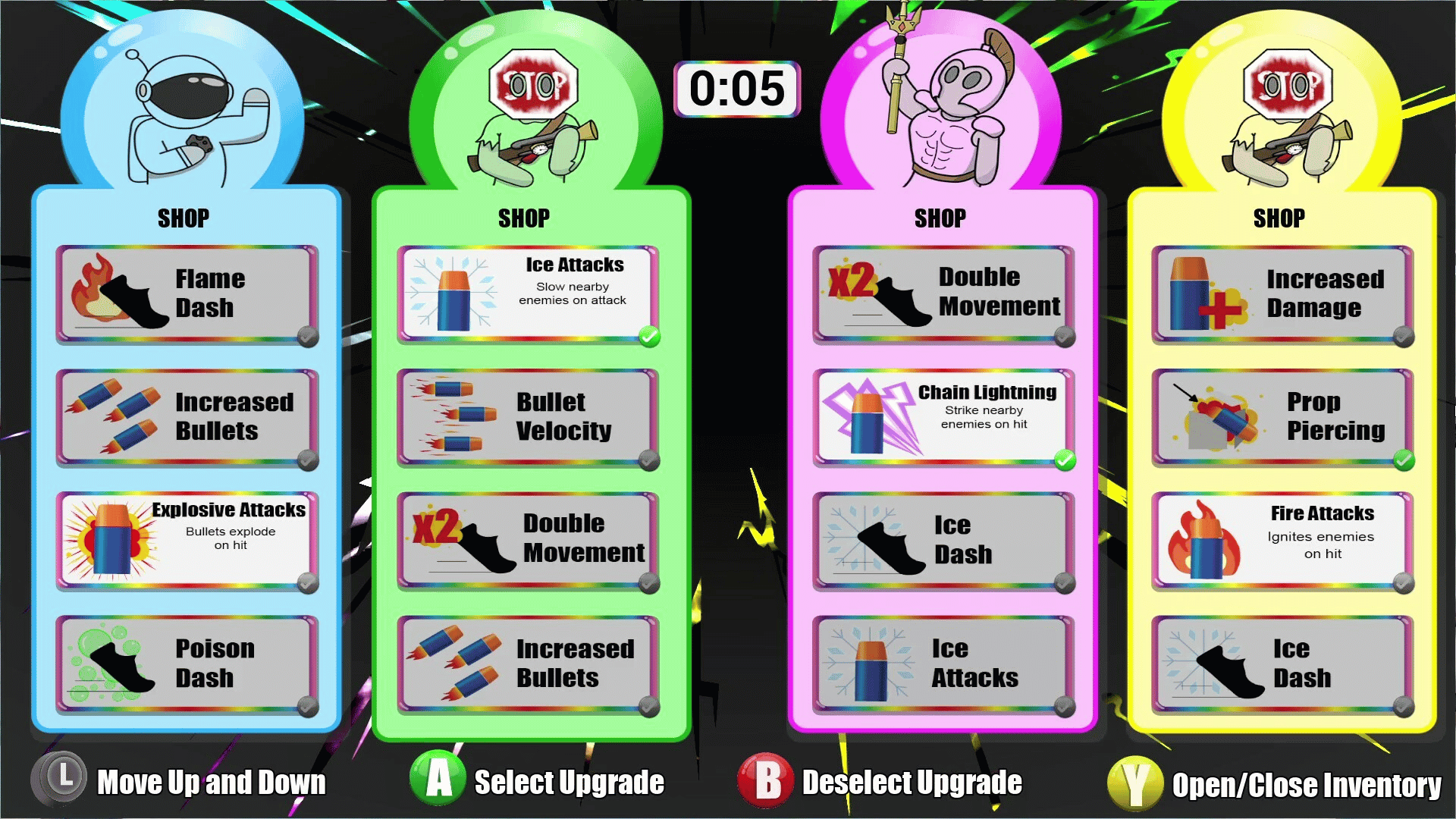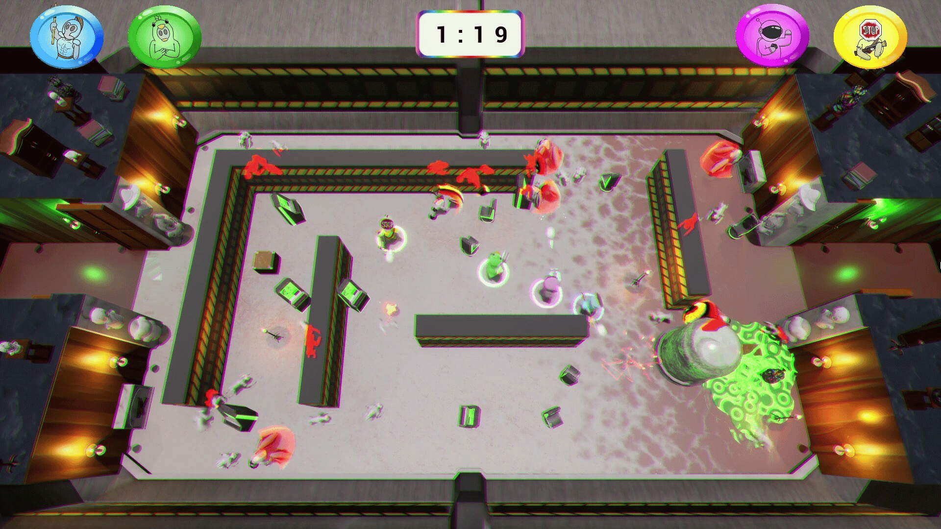 Twin-stick shooter roguelite with environment-merging levels! With 1-4 players, survive for two minutes in each level while waves of relentless enemies are sent to attack you! Combine powerful upgrades and earn your freedom in this wacky interdimensional gauntlet!
