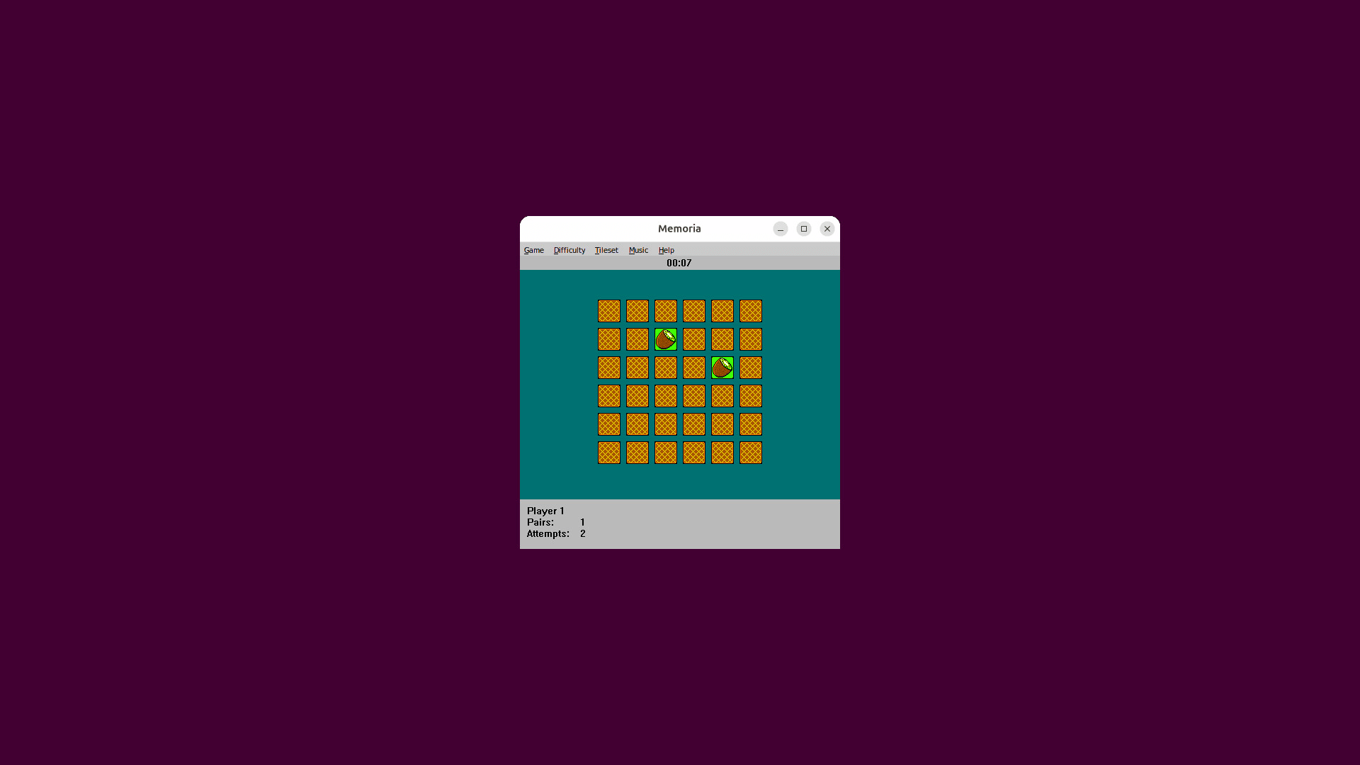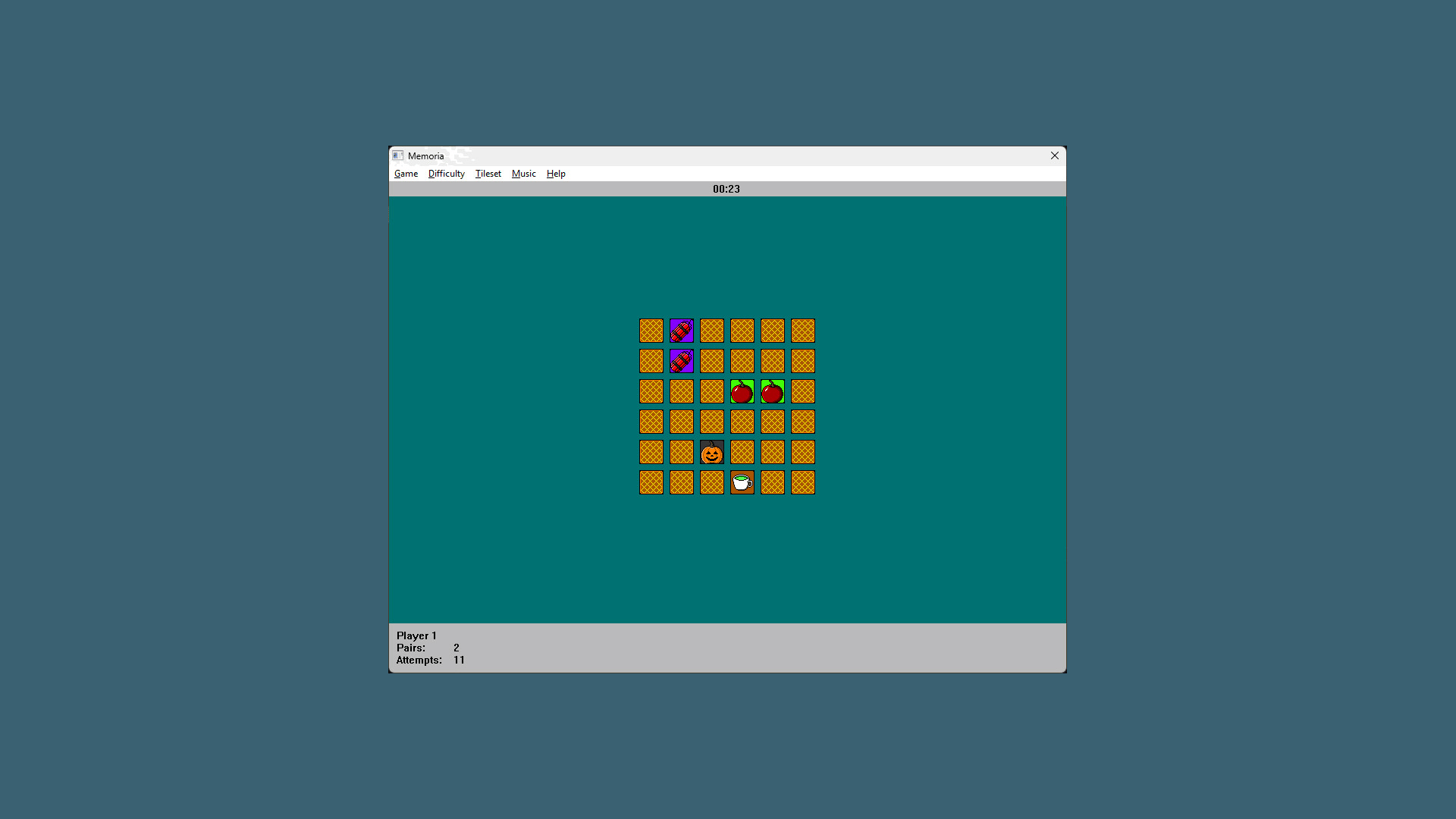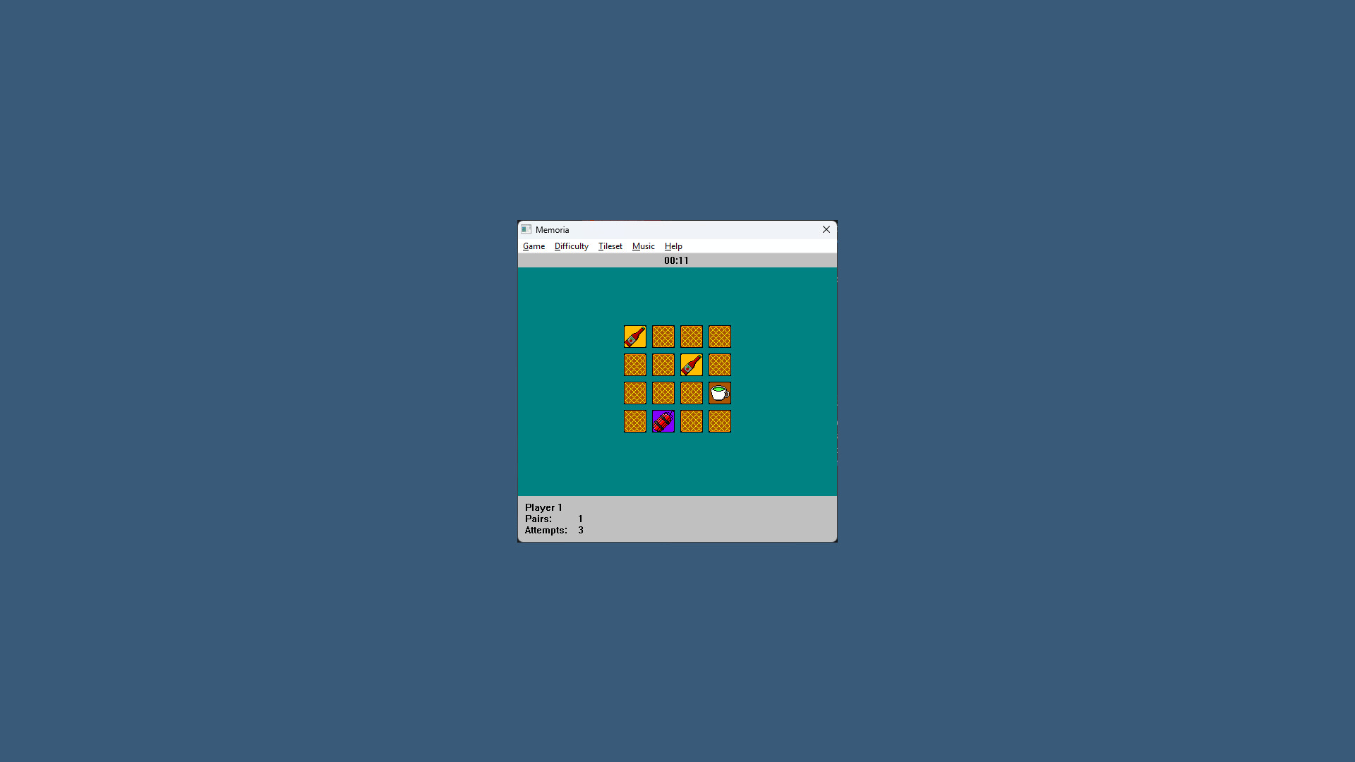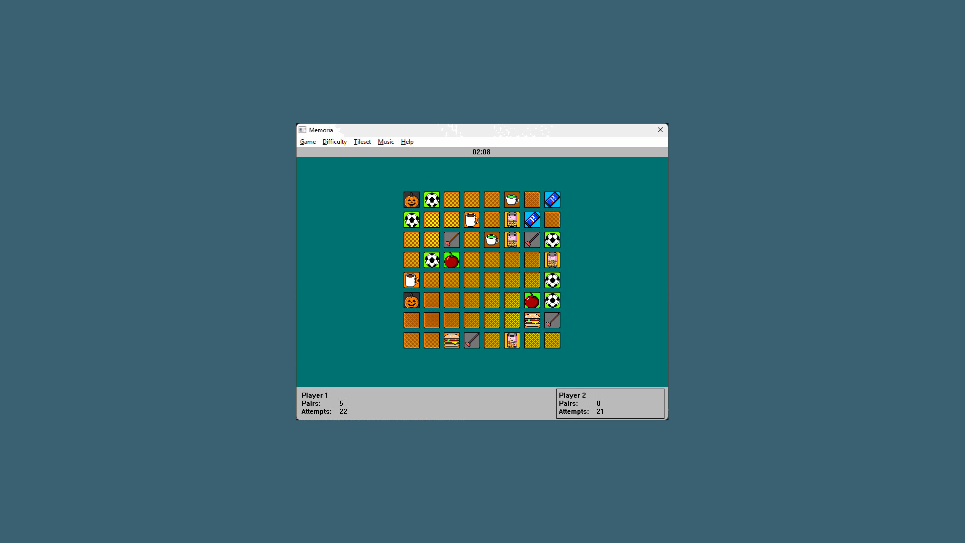 Memoria is a classic memory matching game designed for Windows 3.1. Players are presented with a grid of face-down tiles, each holding a pictogram. The Objective is to find all matching pairs by flipping two tiles at a time.