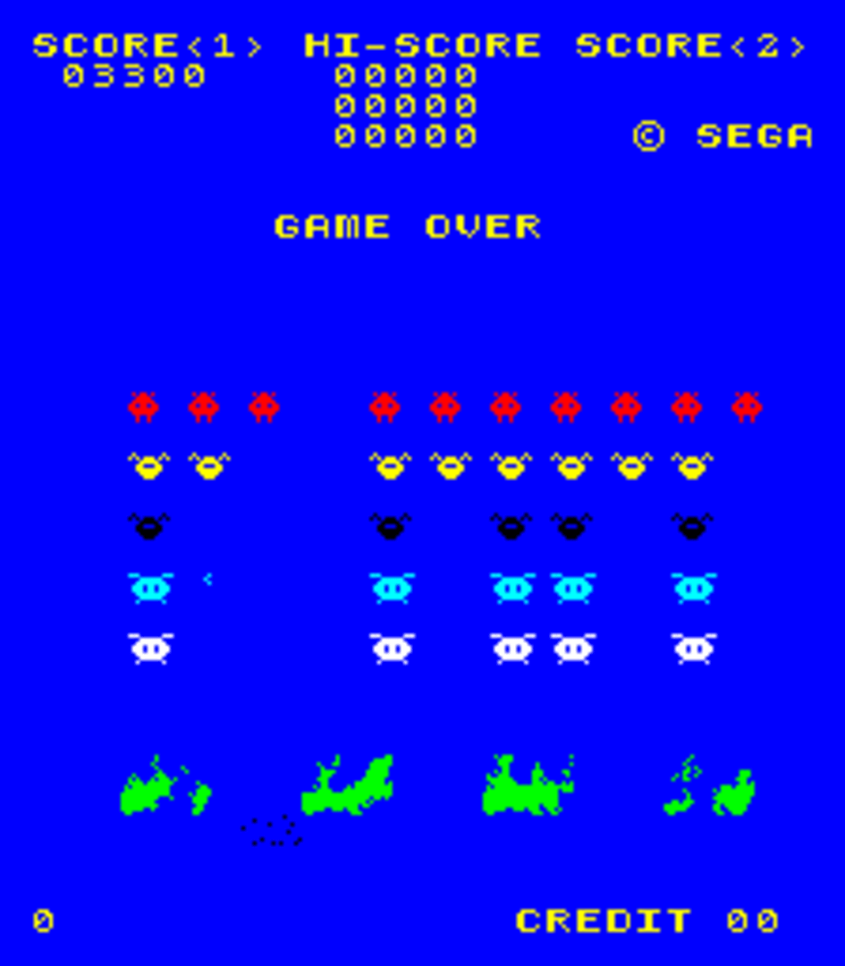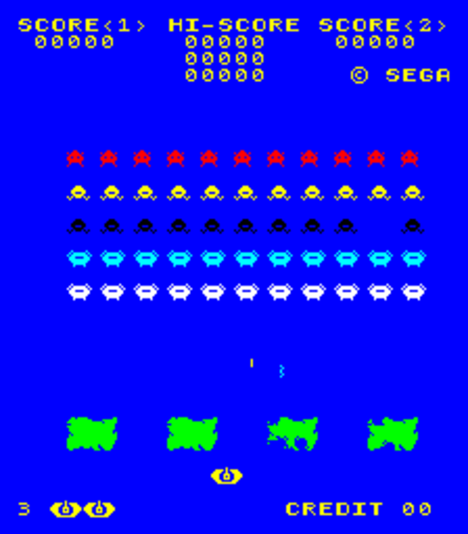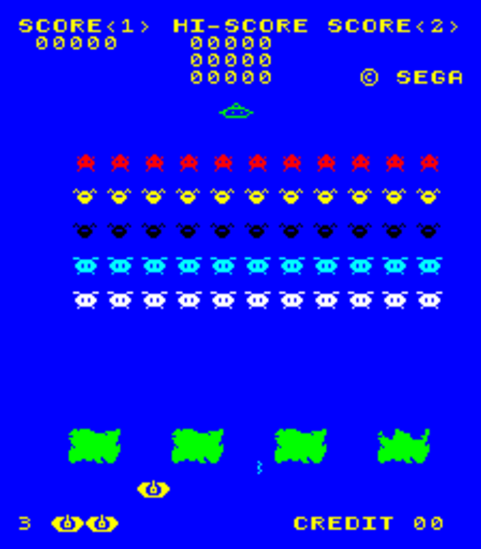Space Attack is an arcade shooting game, released by Sega for VIC Dual hardware in 1979. In the US it is thought to have been renamed Super Space Attack - whether there are in fact two separate games is currently unknown, but the two are extremely similar and "Super" is often dropped in internal Super Space Attack documents. It's a Space Invaders clone and is almost identical to Taito's classic. It is completely identical to another VIC Dual Space Invaders clone, Alpha Fighter, sharing full color graphics and a "bonus" round (in which the saucer briefly descends from the top of the screen after clearing the rest of usual set of invaders). Space Attack has a different set of graphics to Alpha Fighter, however. Similar to versions of Space Invaders, the upright cabinets for Space Attack use a mirror to project the image onto a textured surface (in this case, a starfield), giving the illusion that there is a background while playing.