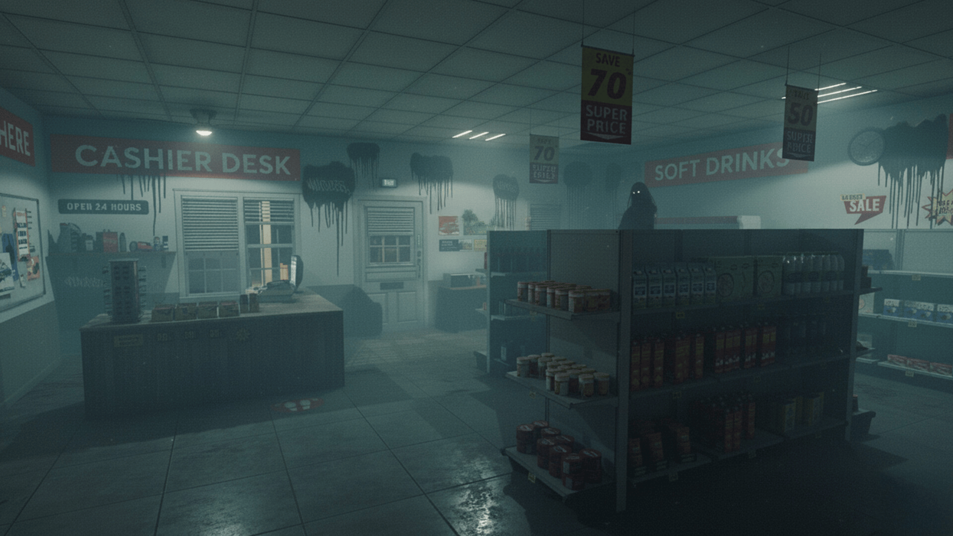 A roadside store where the night never feels safe. Flickering lights, endless aisles, whispers from the dark. Each task feels like research into fear—you restock, you lock, you fight to keep the seal closed.The silence breaks, the air is heavy, and every moment is research into survival.