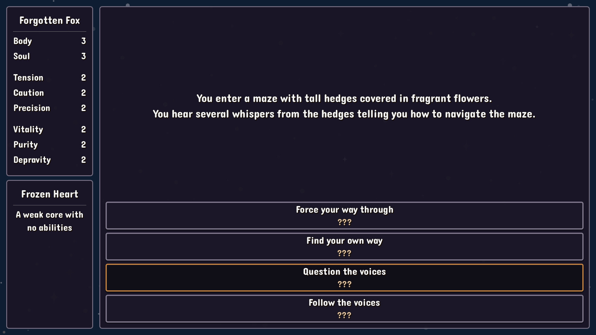 FoxHaunt is a choice-based RPG with turn-based battles. You are the Forgotten Fox. Find and fight the other fox spirits so that you will be remembered.