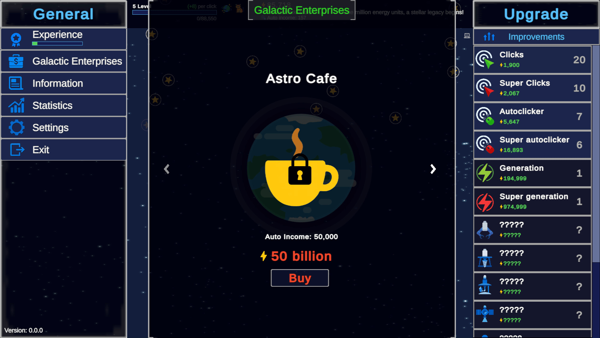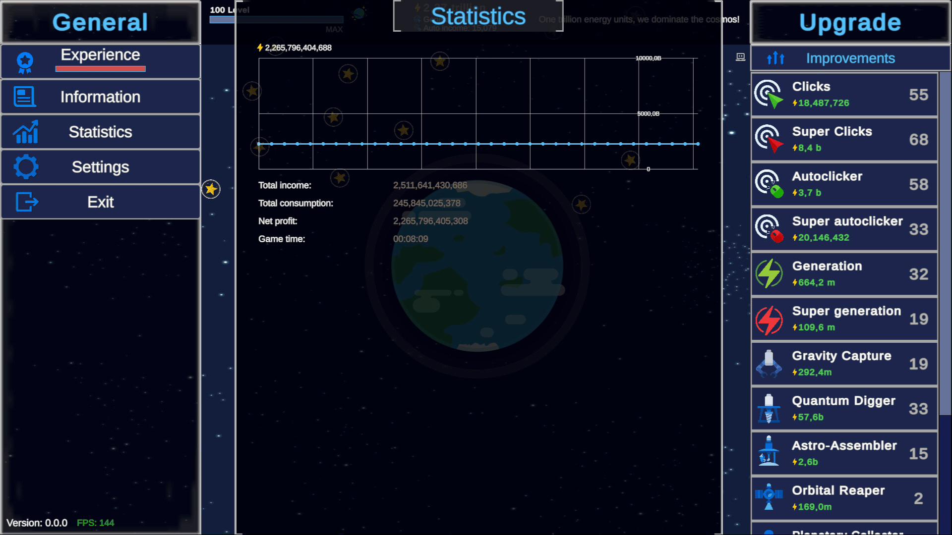 Clicker Astro Planet: collect energy, XP, eggs! Buy planets, level up, track stats!