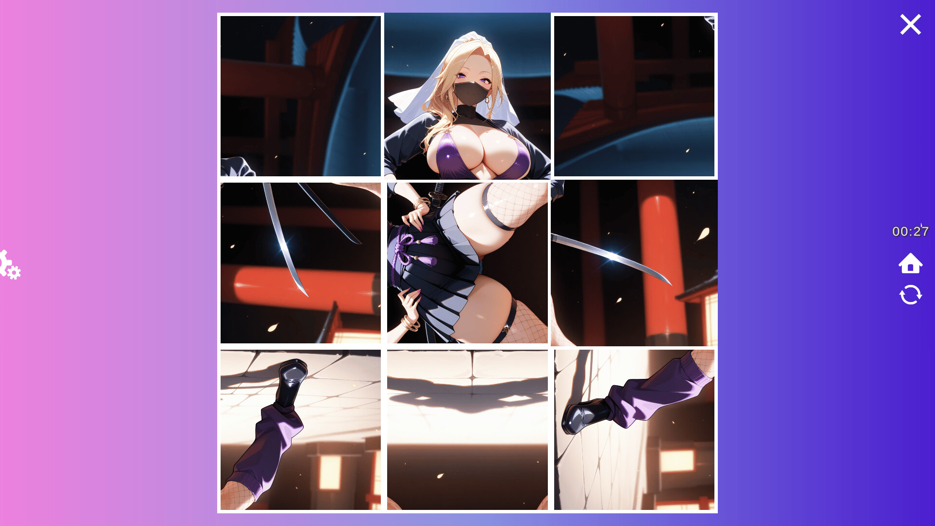 Sexy shinobi puzzle game. Solve 15-puzzle, swipe and rotate modes to reveal spicy art. Two difficulties and soothing music.